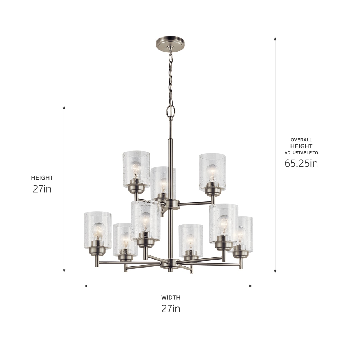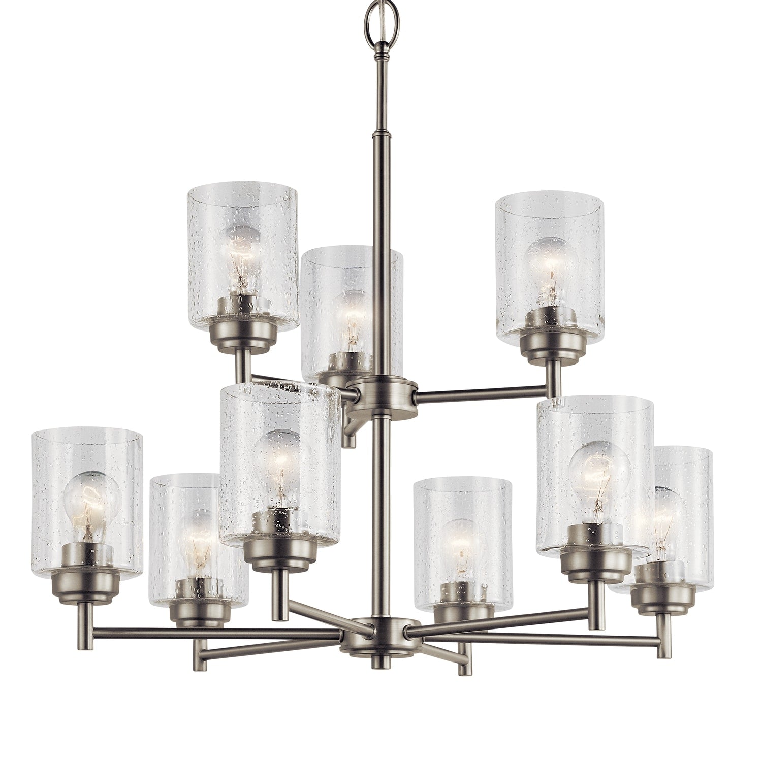 Illuminate your space with the Kichler Winslow 9-Light Chandelier in a sophisticated brushed nickel finish. With its modern elegance and clear seeded glass shades, this two-tiered chandelier provides a stunning centerpiece for dining rooms or kitchens, blending seamlessly with traditional to contemporary décor.