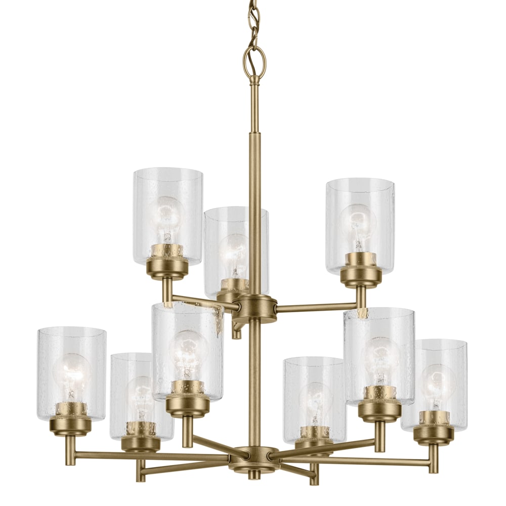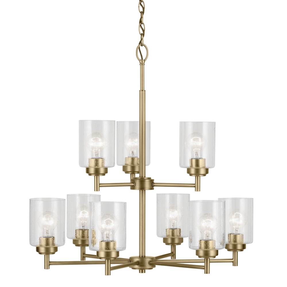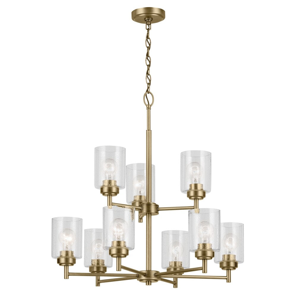 Transform your space with the Winslow 9-Light Industrial Chandelier by Kichler, featuring a sleek natural brass finish and an elegant, airy design. This chandelier combines industrial charm with modern refinement, ideal for enhancing dining rooms, kitchens, or foyers. With its clear seeded glass shades, it provides both functional lighting and a sophisticated aesthetic, fitting seamlessly into contemporary spaces.
