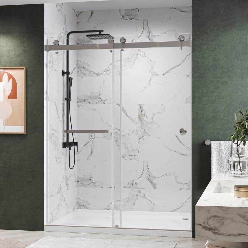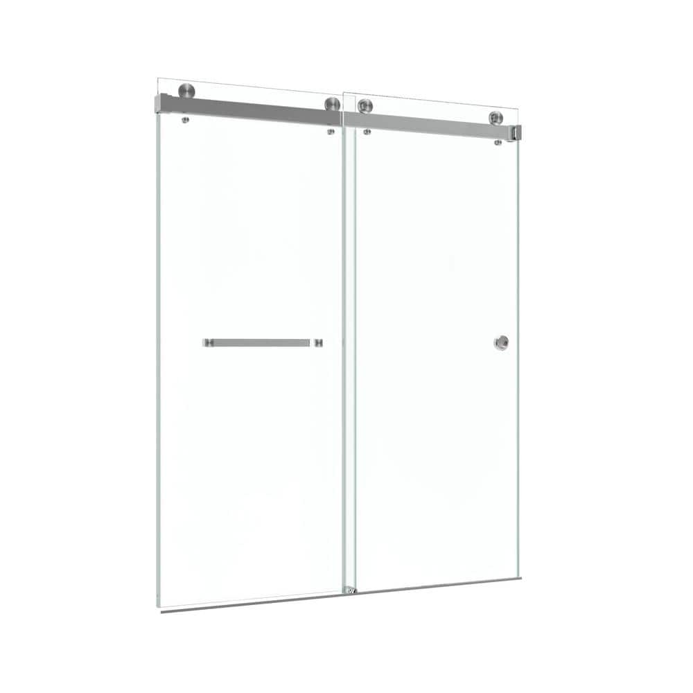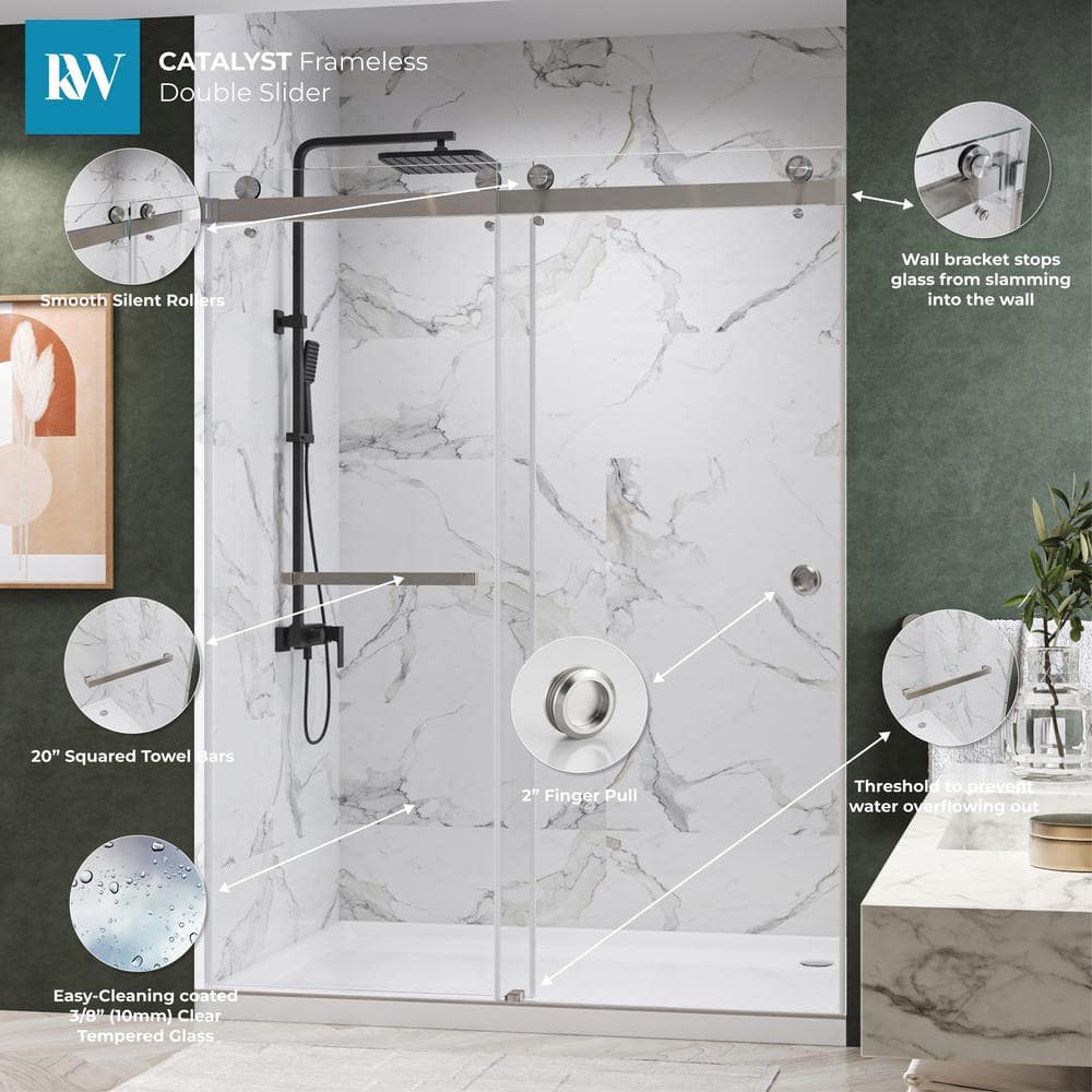 The Kobiworks CatalystFP Double Sliding Frameless Shower Door in Brushed Nickel combines modern elegance with practical functionality. Its sleek, frameless design features 3/8-inch clear tempered glass that is both easy to clean and provides durability. The innovative double sliding door design offers seamless access and enhances the luxury of your bathroom space.