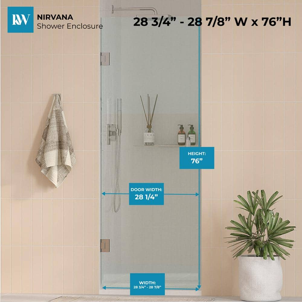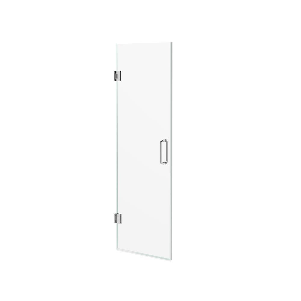 Elevate your bathroom experience with the Kobiworks Nirvana Frameless Hinged Shower Door. This stunning piece features 3/8 inch clear tempered glass, offering both elegance and robust durability. The sleek chrome hardware adds a modern touch, while its frameless design creates an open, airy feel for your shower space.