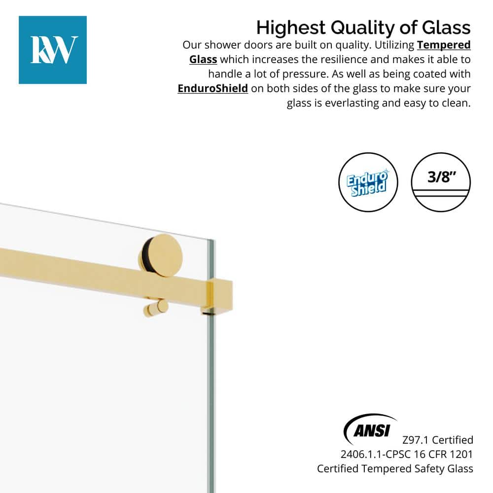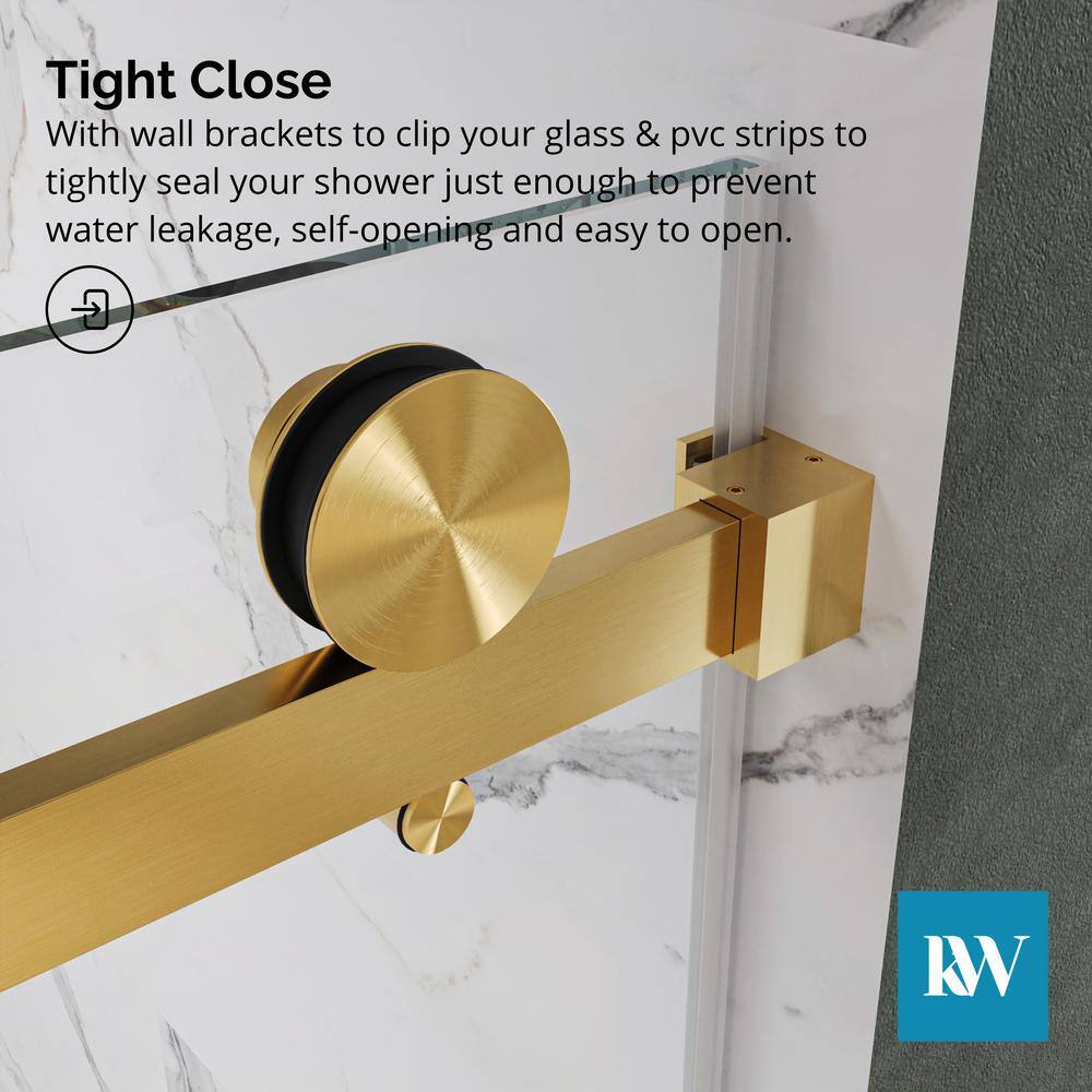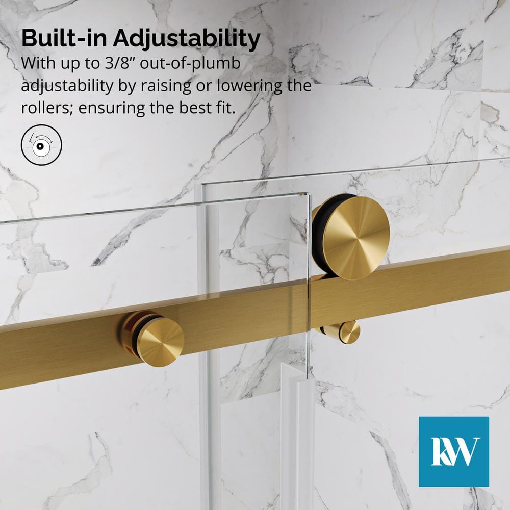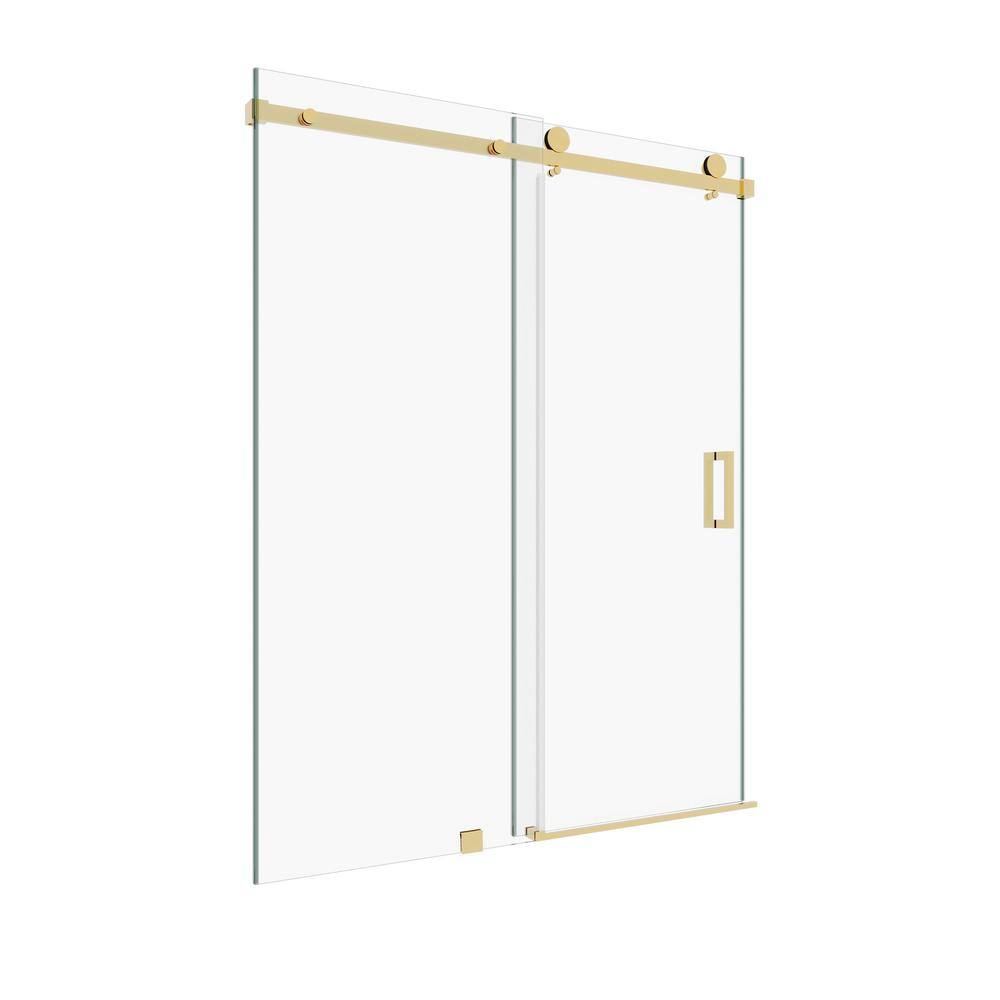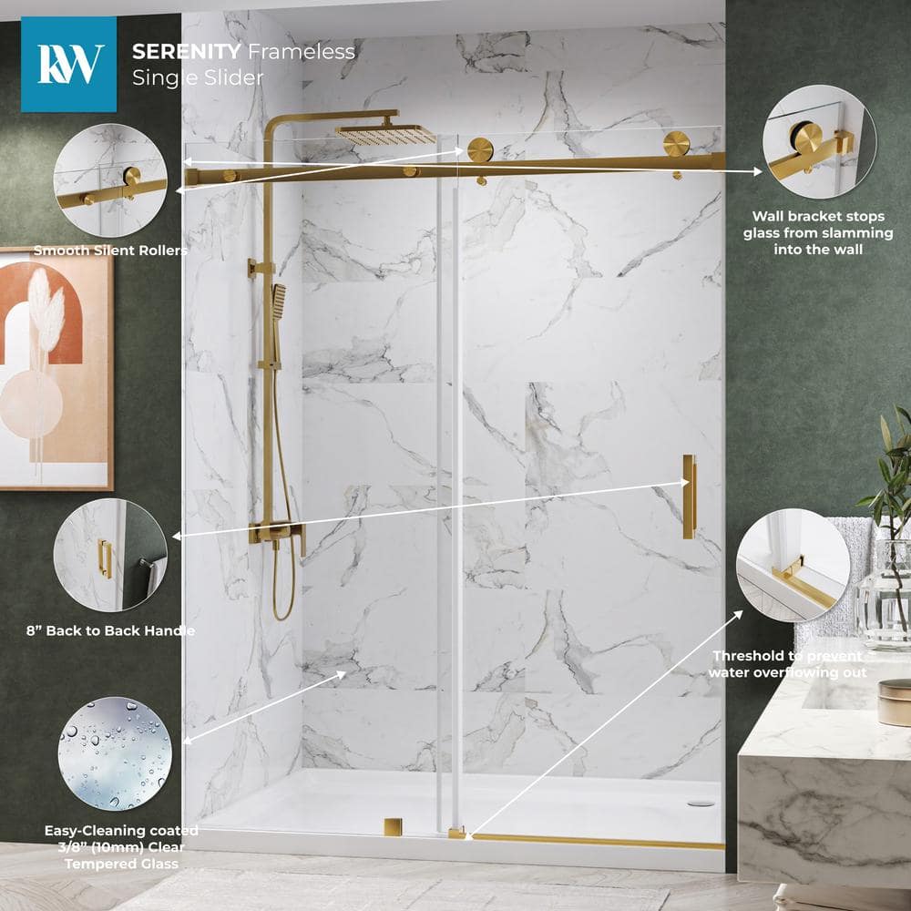 Elevate your bathroom with the Kobiworks Serenity 60 in. W x 79 in. H Single Sliding Frameless Shower Door. Featuring a sleek brushed gold finish and 3/8 in. clear tempered glass, it seamlessly combines minimalist elegance with modern functionality. Designed for easy installation and effortless maintenance, this shower door is the perfect choice for an upscale bathroom revamp.