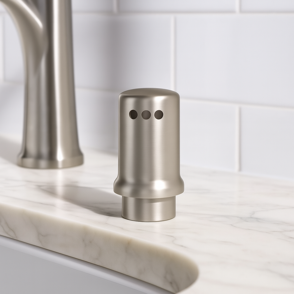 The KOHLER Air Gap Body with Cover in Vibrant Brushed Nickel prevents wastewater backflow in kitchen systems, ensuring clean plumbing. Its solid-brass cover and brushed nickel finish complement KOHLER faucet designs.