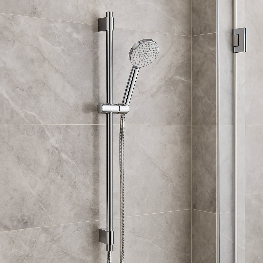 The KOHLER Awaken Shower Kit in polished chrome combines style and functionality, featuring corrosion-resistant finishes and an adjustable wall bar for a tailored showering experience.