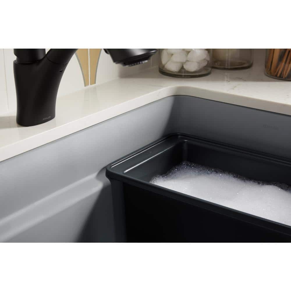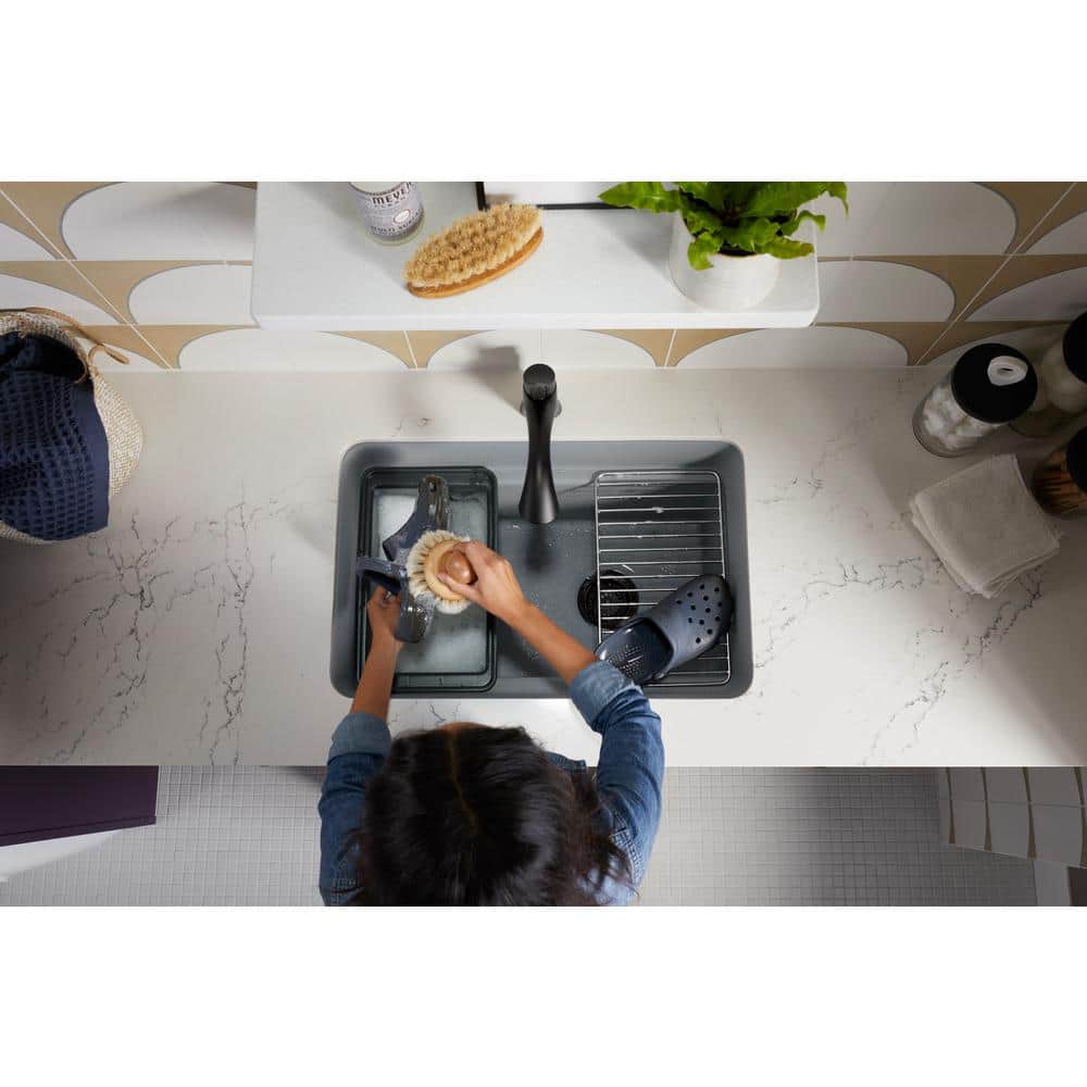 Imagine transforming your everyday utility zone into a sanctuary of elegance with the KOHLER Cairn sink. The soft curves and richly hued matte grey finish create a sophisticated focal point, while its Neoroc composition ensures unmatched durability. Utilize the sliding utility rack for a streamlined workspace, perfect for both practical tasks and crafting artisanal home treats. Make this sink a central piece of luxurious functionality that embodies both style and substance.
