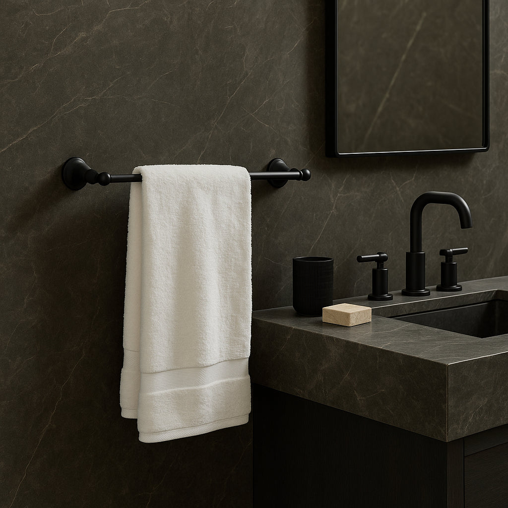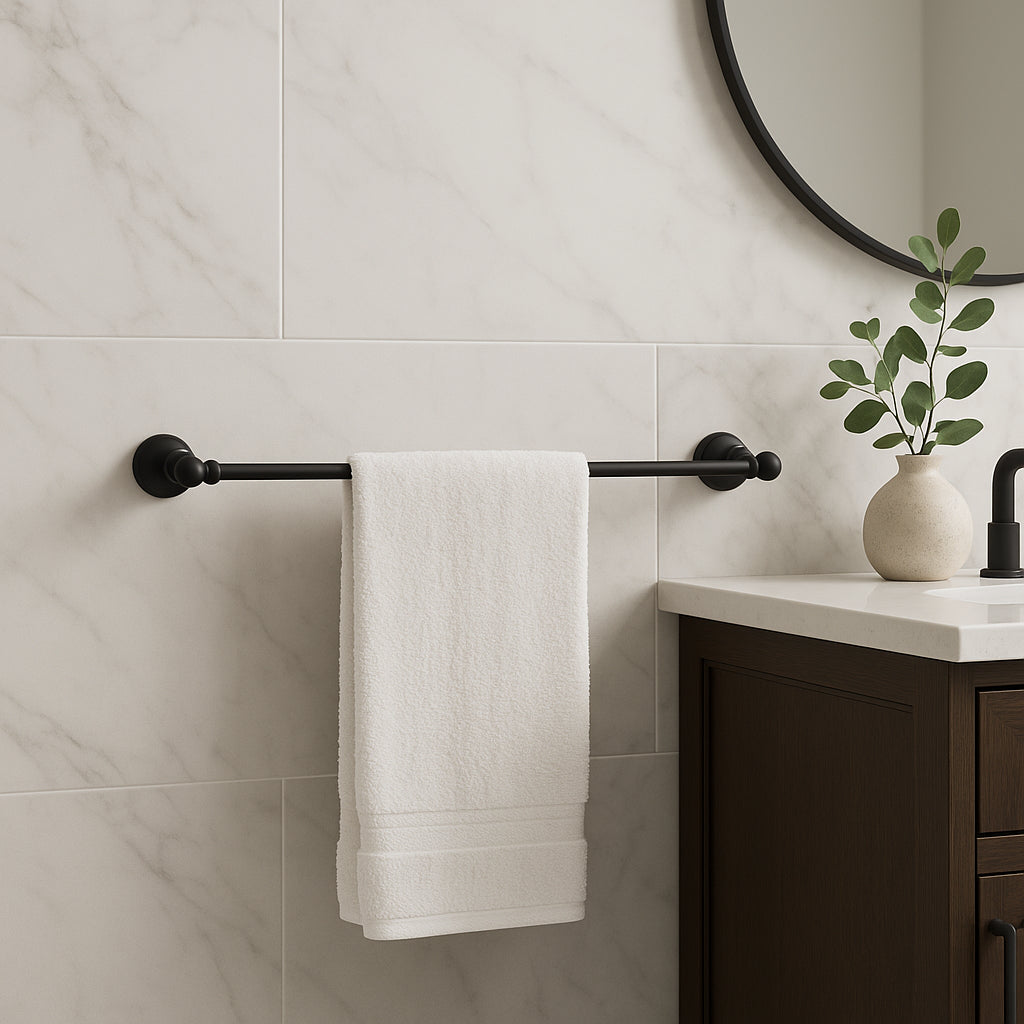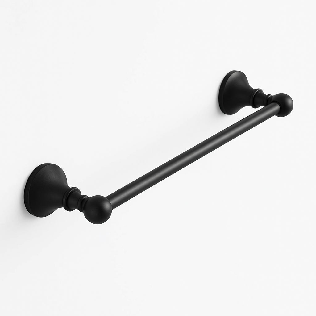 Transform your bathroom into a serene retreat with the KOHLER Capilano Towel Bar in Matte Black. This exquisite piece marries timeless vintage charm with modern design through its distinct spherical accents and sleek finish. Integrate it with soft, plush towels in white or neutral tones to amplify its striking black hue, offering a contrast that is both bold and sophisticated. This towel bar is more than a functional necessity—it is an essential element of luxurious living, offering both style and substance.