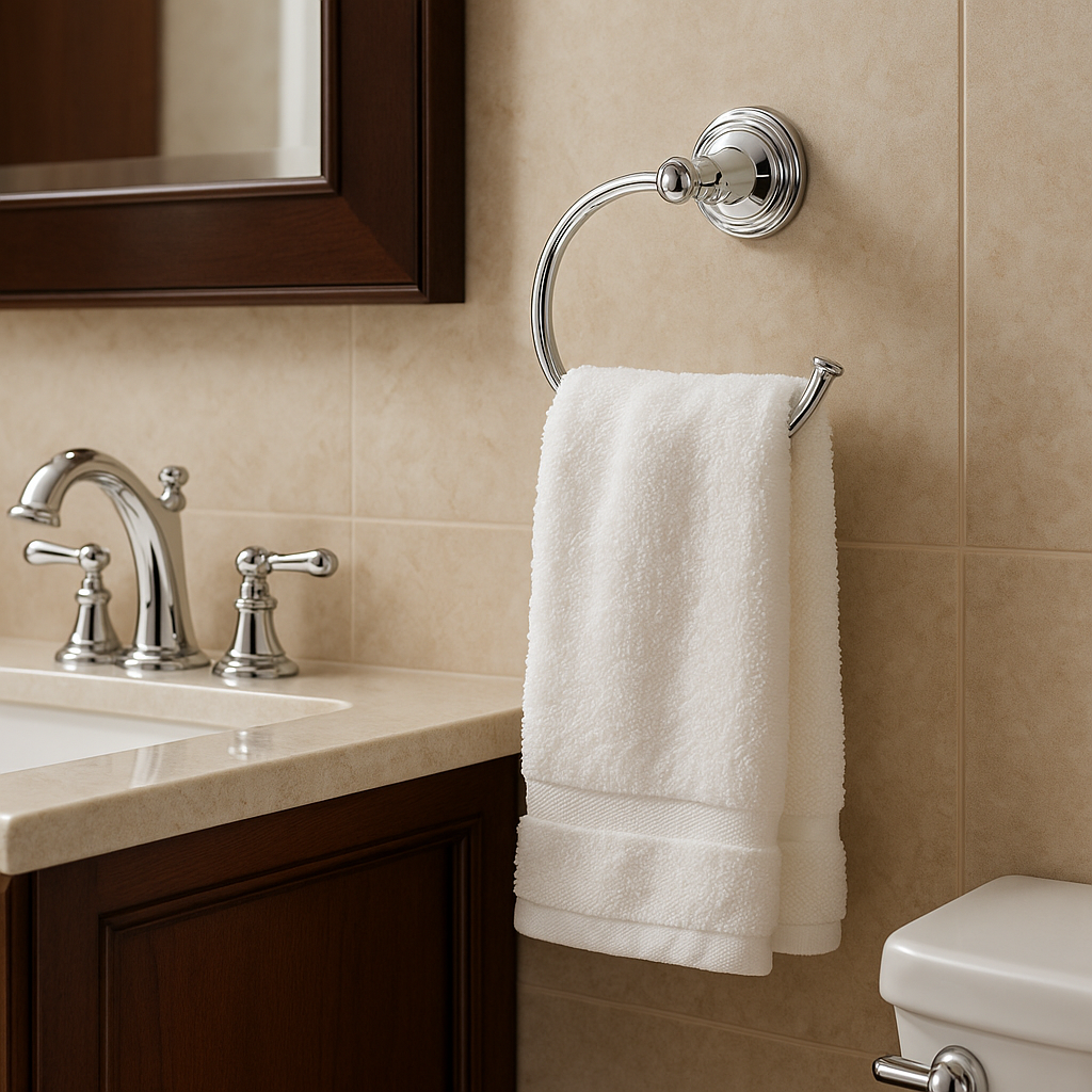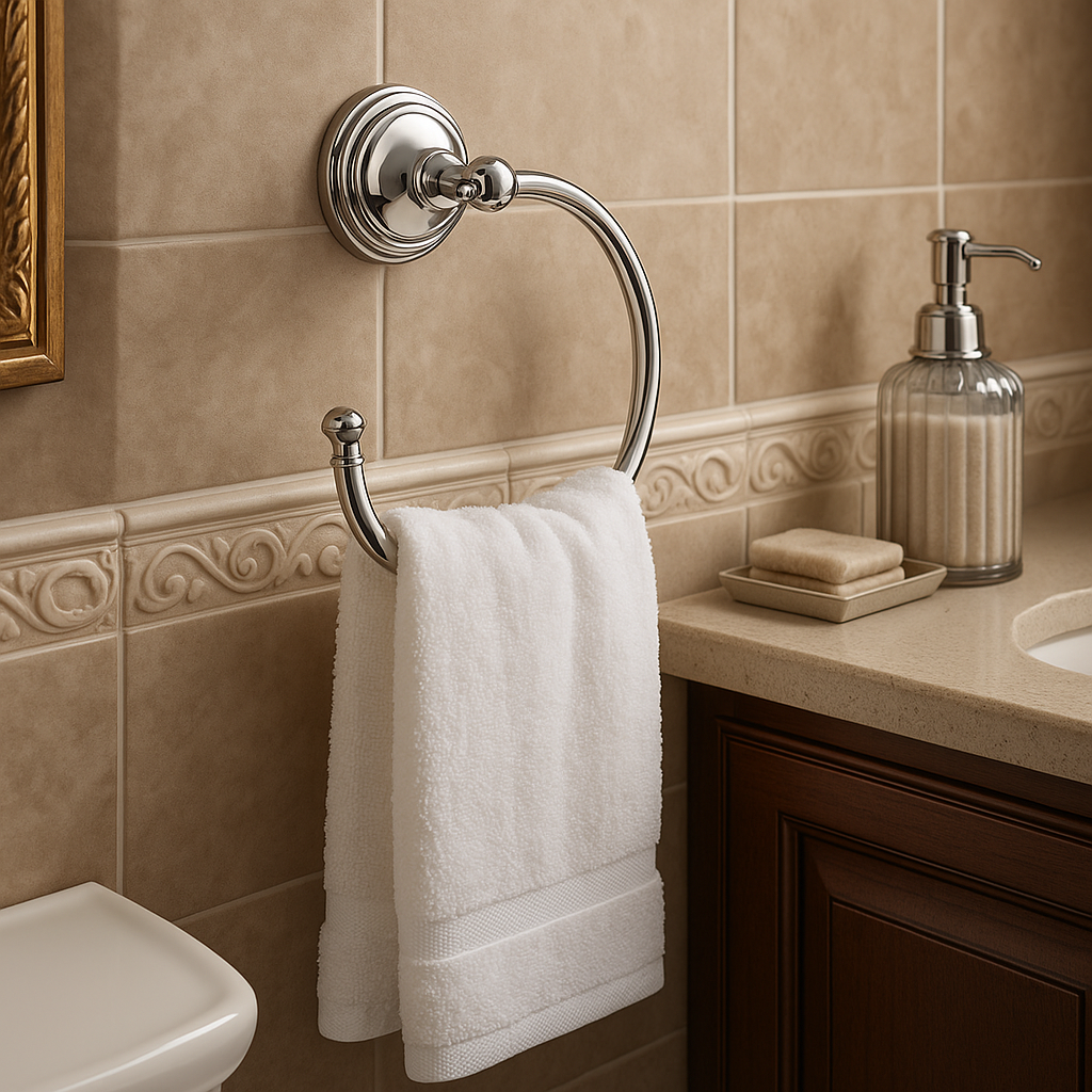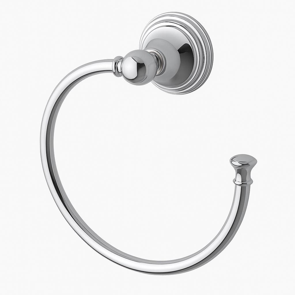 The KOHLER Devonshire Towel Ring in Polished Chrome offers a blend of durability and style. Its corrosion-resistant finish and sturdy brass construction ensure long-lasting use, while its elegant design complements the Devonshire collection.