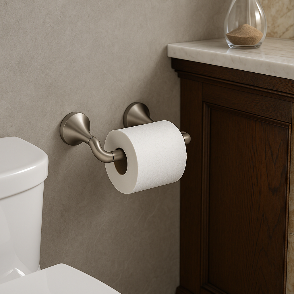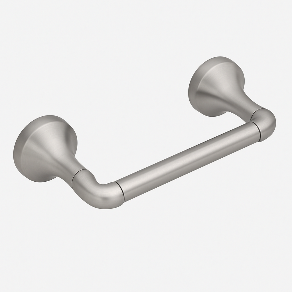 The KOHLER Elliston Pivoting Toilet Paper Holder in Brushed Nickel combines durability with elegance. Its pivoting design simplifies roll changes, while the brushed nickel finish resists corrosion and tarnish, ensuring long-lasting beauty.