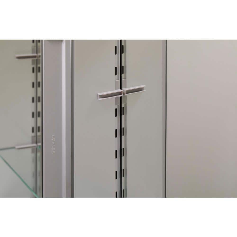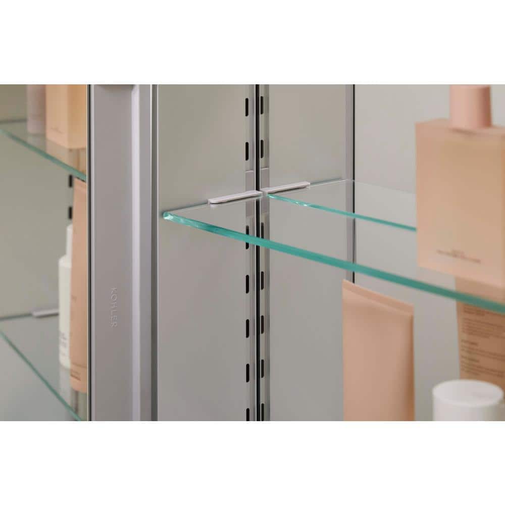 The KOHLER Embark Premium XL Medicine Cabinet adds style and functionality to any bathroom with its mirrored surfaces and adjustable glass shelves. The frameless design and anodized aluminum finish create a sleek look, while offering ample storage space for toiletries.