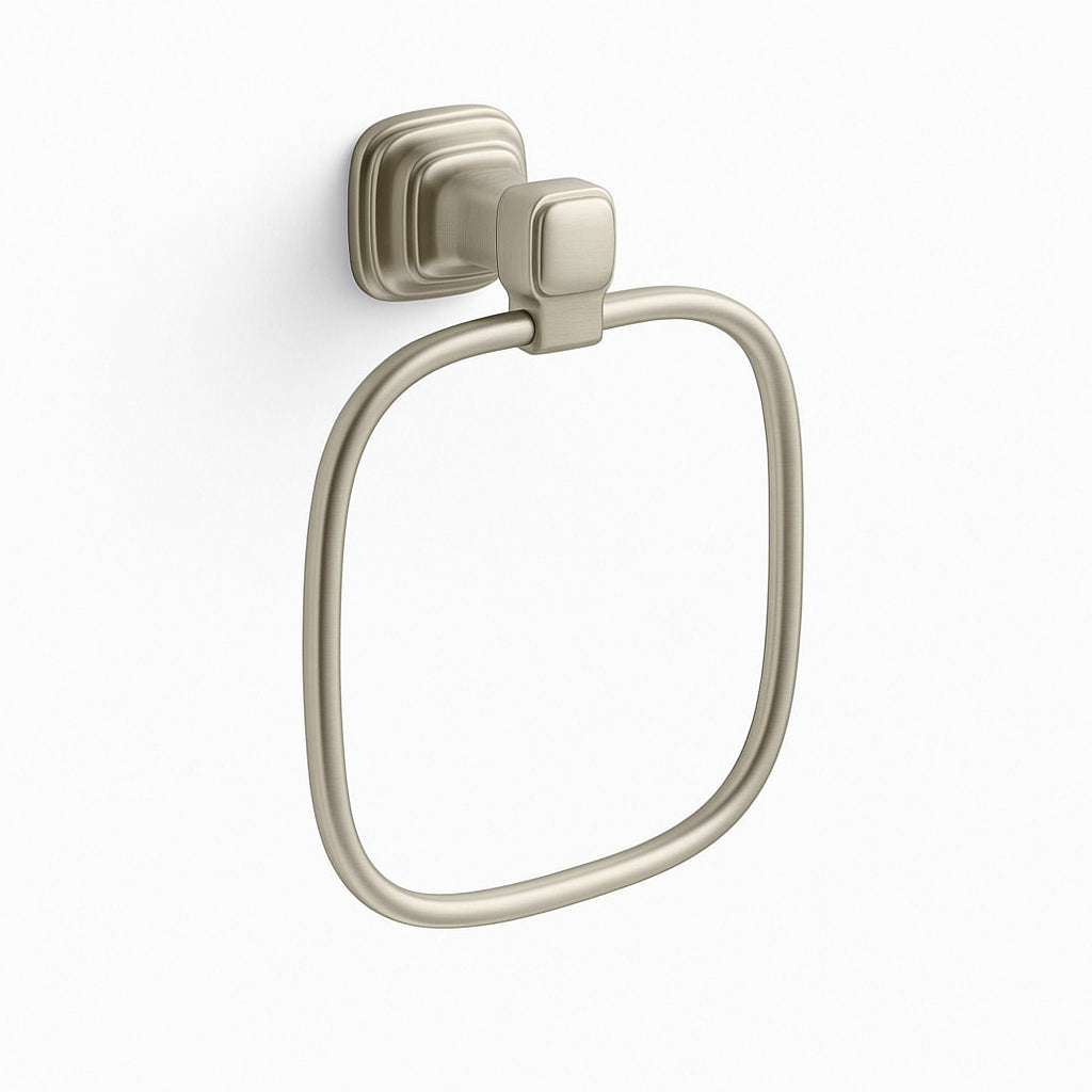 The KOHLER Numista Towel Ring in Brushed Nickel seamlessly elevates your bathroom to a chic haven with its subtle interplay of sharp, square edges and a soft, brushed finish. It’s a masterpiece of modern design that doesn't just hang a towel but accentuates the very essence of your space. Envision it flanking a minimalist vanity or set against dark, moody tiles for an enticing contrast. An essential in any luxe bathroom, this towel ring embodies both functionality and refined style with the unyielding charm only KOHLER can offer.