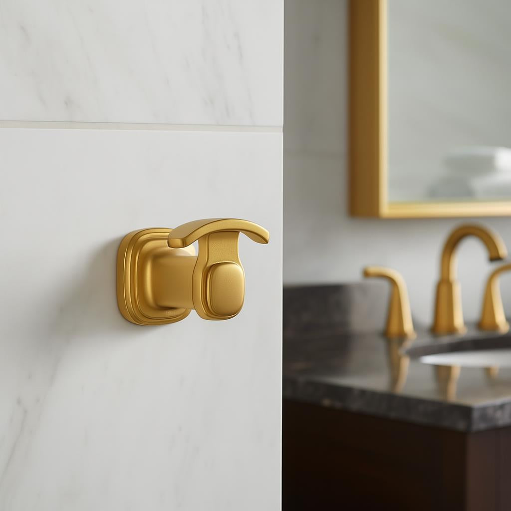 The KOHLER Numista Wall Mount Robe Hook combines industrial modern design with functionality, featuring a Vibrant Brushed Moderne Brass finish and durable metal construction. Easy to install, it adds elegance and practicality to any bathroom.