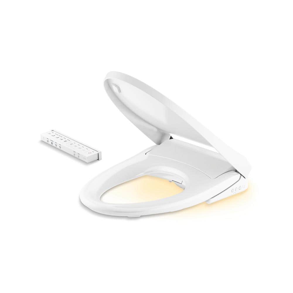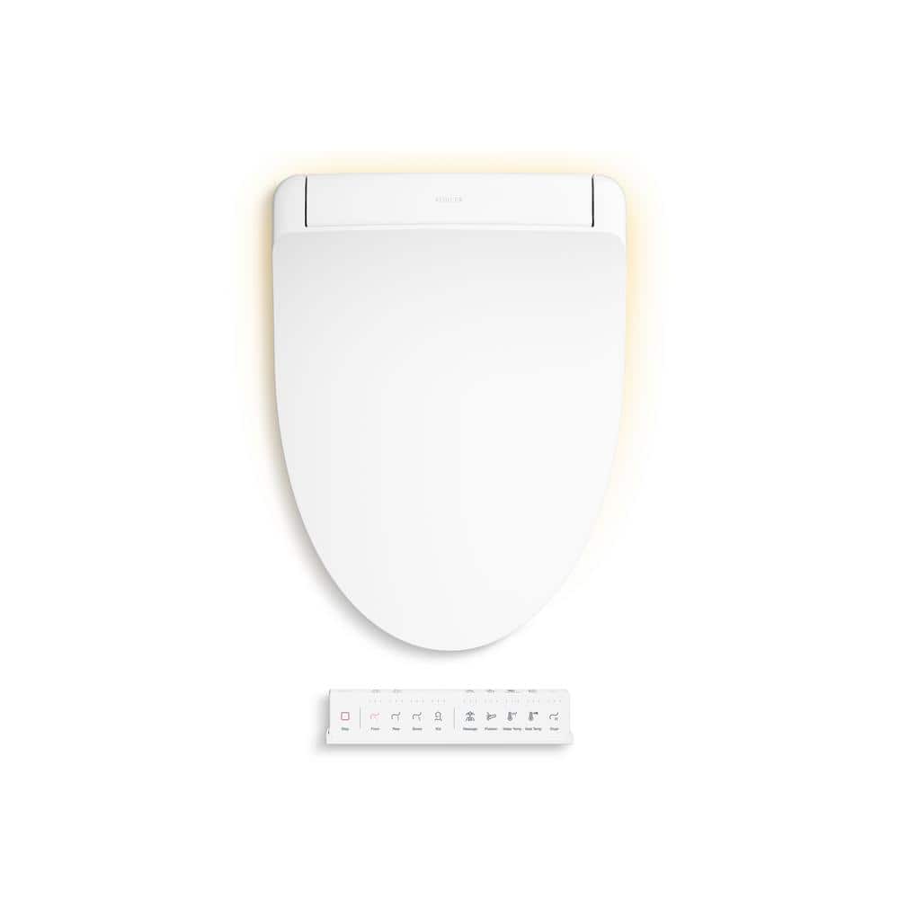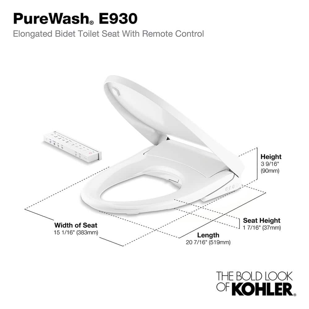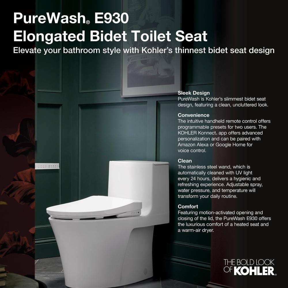 Experience the epitome of luxury and hygiene with the KOHLER Pure Wash E930, an elongated bidet toilet seat with cutting-edge features like adjustable water temperature, a handheld remote control, and UV self-cleaning technology. With a sleek design and easy installation, it transforms your bathroom setup with soothing elegance and advanced functionality.
