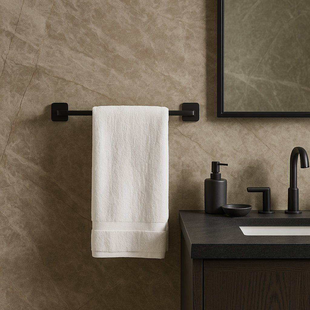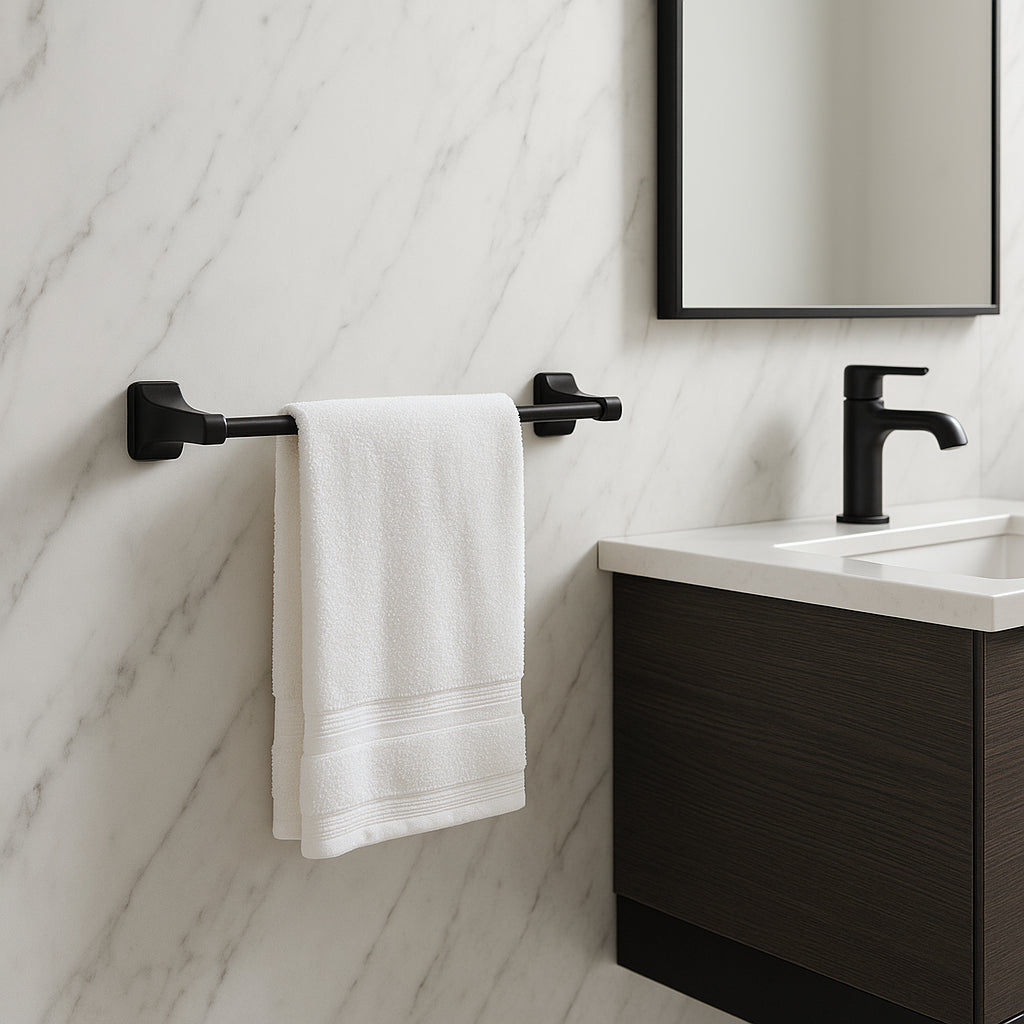 A: This towel bar coordinates beautifully with faucets and accessories in the KOHLER Rubicon collection for a cohesive bathroom design.