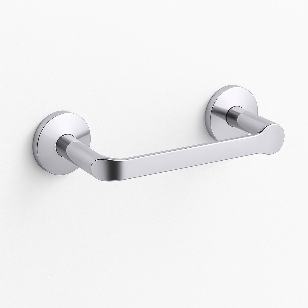 The KOHLER Simplice Toilet Paper Holder combines elegant design with practical functionality. Made from durable metal and finished in polished chrome, it features a pivoting mechanism for easy roll changes and includes mounting hardware for hassle-free installation.