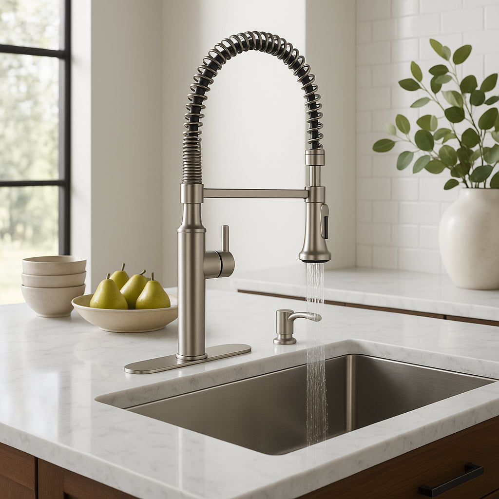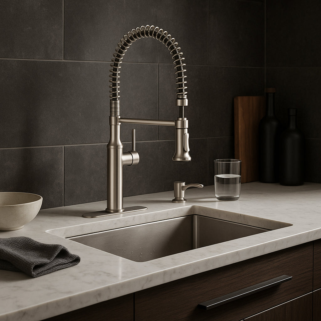 The Kohler Sous Pro-Style Faucet transforms your kitchen into a chef's haven with its industrial-inspired design and professional-grade functionality. Its exposed-spring design adds a touch of modern sophistication, while the dual spray function ensures effortless cleaning. Pair it with a sleek countertop to create a harmonious and stylish workspace. This faucet is not just a tool but a statement piece for luxurious living.