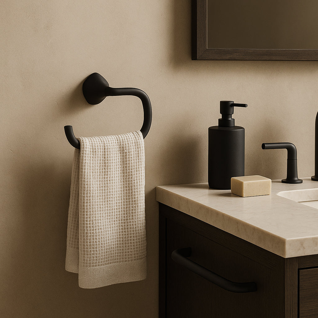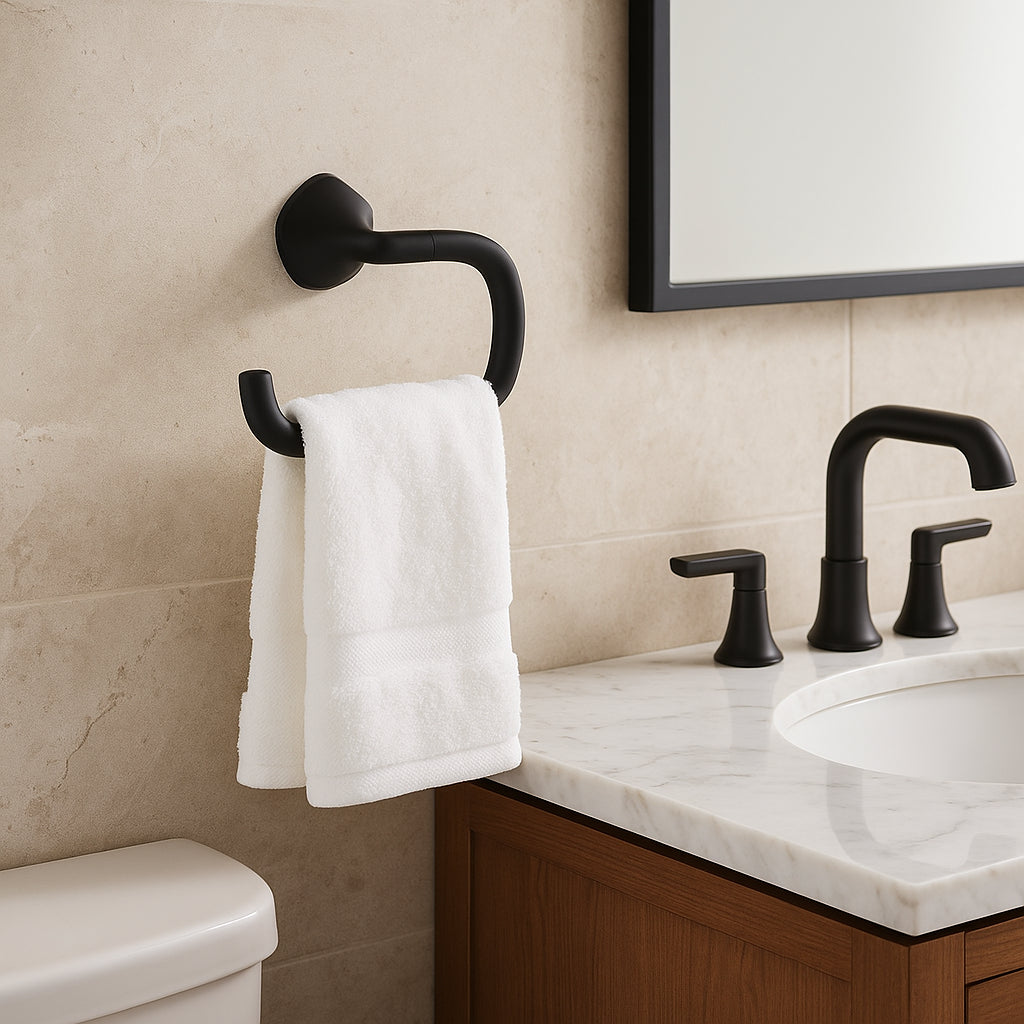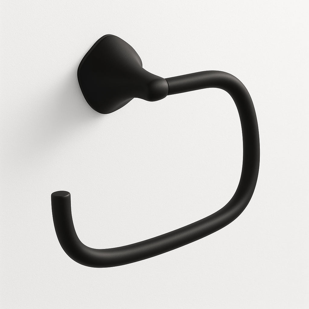 The KOHLER Sundae Towel Ring in Matte Black combines elegance and functionality. Its durable metal construction and corrosion-resistant finish ensure long-lasting use, while its sleek design adds a sophisticated touch to any bathroom.