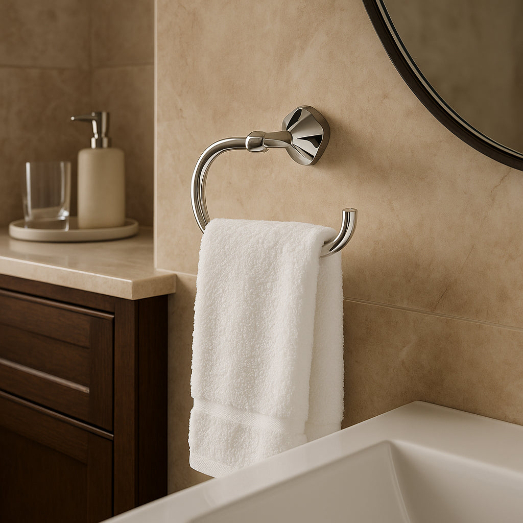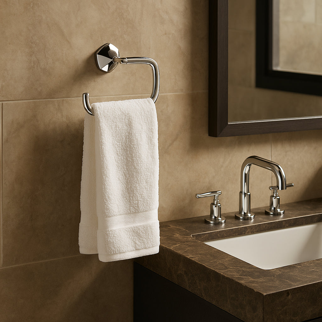 KOHLER's Sundae Wall-Mounted Towel Ring transforms any bathroom into a sanctuary of refined elegance. Its fluid, elongated curves and polished chrome finish bring a sense of quiet sophistication, turning a utilitarian space into a luxurious retreat. Position it near the vanity to accentuate soft towels in earth tones or rich textures, creating a harmonious blend with your faucet fixtures. This towel ring isn't just functional—it's a design necessity for those who appreciate the intersection of style and practicality.
