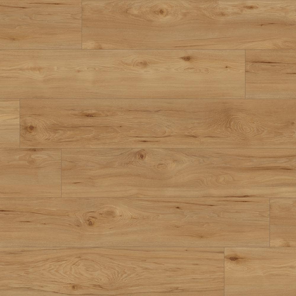 The Howell Elegant Brushed Hickory is a 10mm waterproof laminate wood flooring from Krono Original, designed for durability and style. This golden-brushed hickory not only offers superior resistance to scratching, denting, and fading but also boasts an easy click-lock installation with no underlayment required. It's perfect for any space, promising longevity and aesthetic appeal.