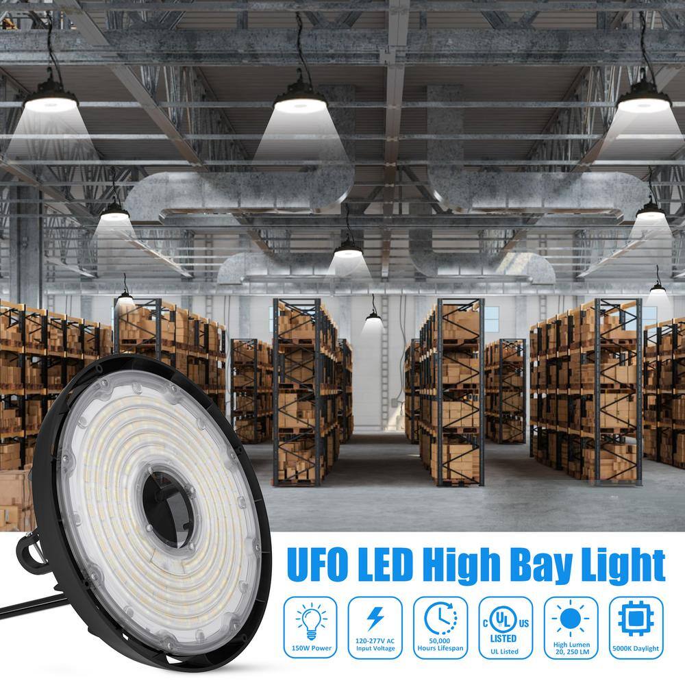 Picture a grand industrial ambiance, where every detail is strikingly visible under the crisp, daylight-balanced glow of the Lecoht 10" 150W High Bay Light. Its UFO silhouette not only provides exceptional illumination but also adds a modern, streamlined aesthetic to large-scale environments. For an impressive display, use these lights to highlight architectural features or create an immersive visual experience in a stadium or warehouse. Such luminance isn't just practical—it's essential for crafting spaces where functionality meets high style.
