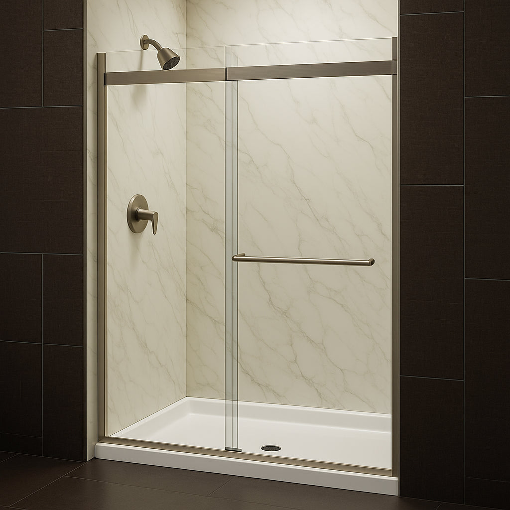 The Levity Semi-Frameless Sliding Shower Door combines modern design with innovative features like CleanCoat+ glass treatment and a cushioned center guide for smooth operation. Its nickel finish and clear tempered glass add a sleek touch to any bathroom.