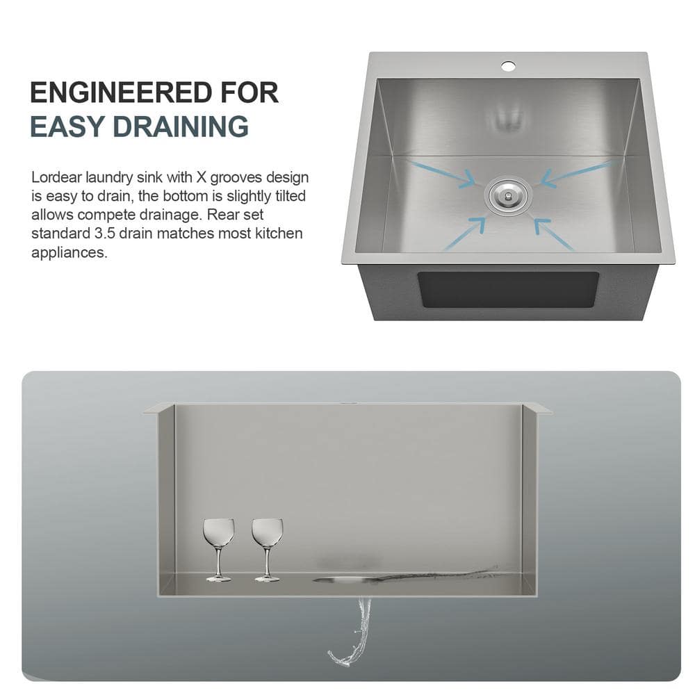 The LORDEAR 22-inch drop-in laundry utility sink is crafted from robust 16-gauge T304 stainless steel, offering exceptional durability and resistance to rust and corrosion. It's designed to fit effortlessly into various spaces, from kitchens to workshops, providing both utility and style. With its sound-dampening features and included strain basket, this sink enhances both functionality and aesthetics in your home or workspace.