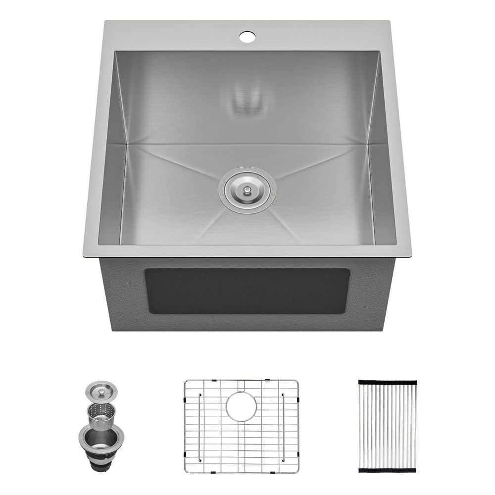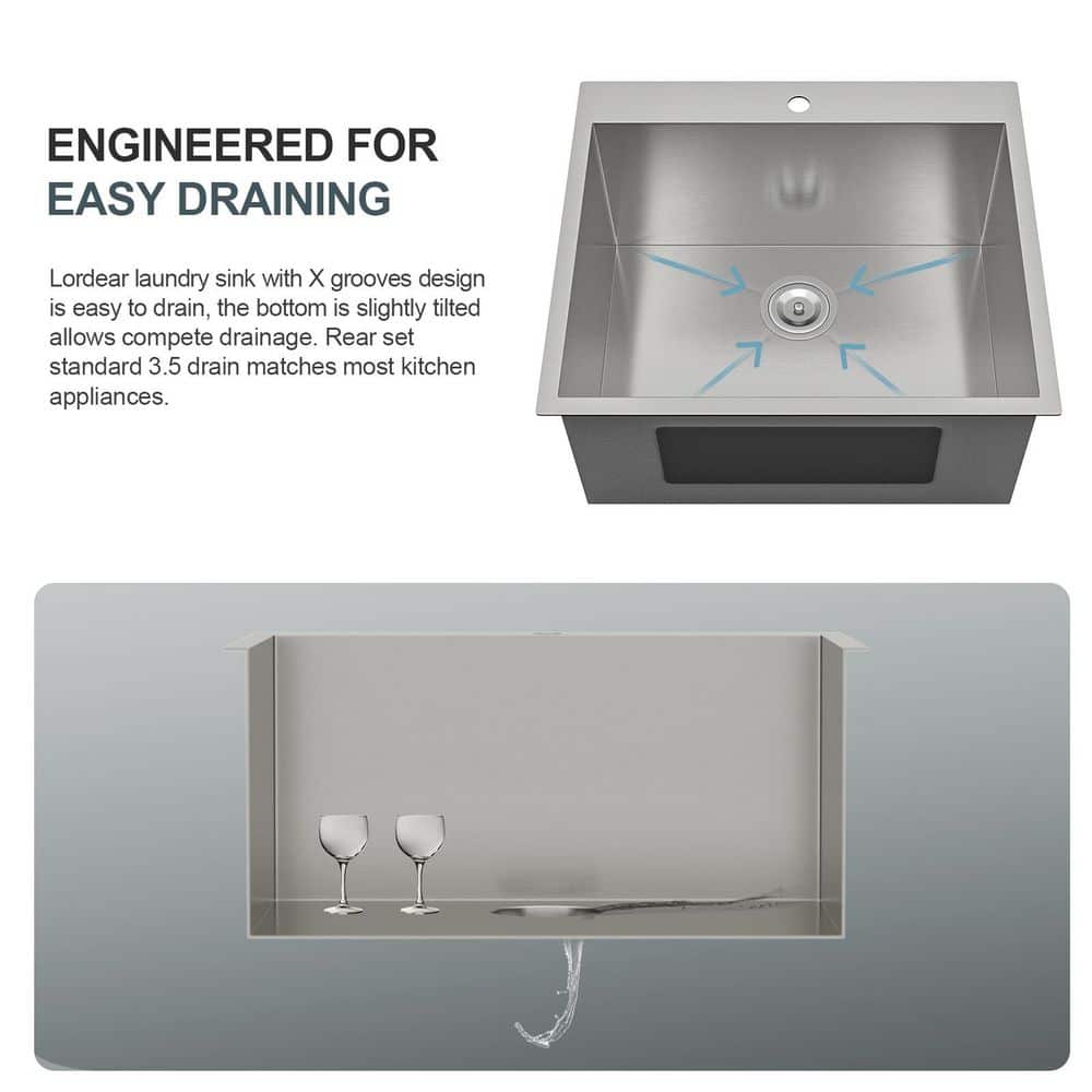 The LORDEAR 22 in. x 22 in. Drop-In Stainless Steel Laundry Utility Sink brings a sleek, modern finish to your utility space. Built with durable T304 16-Gauge stainless steel, this sink offers resistance to dents, scratches, and noise, while providing an elegant brushed finish that pairs well with any style. Equipped with superior sound dampening and a handmade design, it transforms your laundry room into a sophisticated work area.