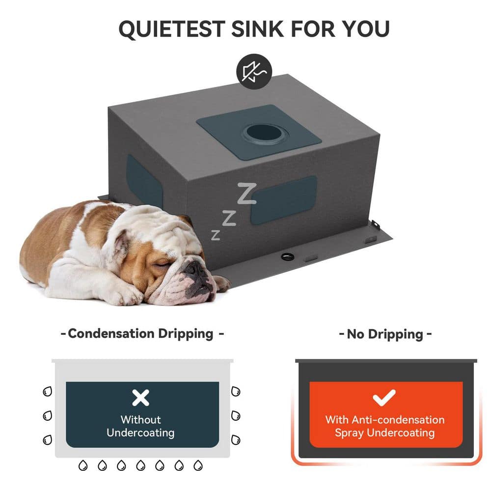 A: This sink features superior sound dampening undercoating and a 3 mm thick sound-absorbing pad, minimizing noise during use.