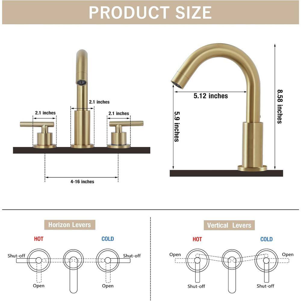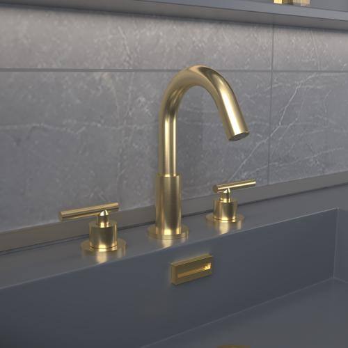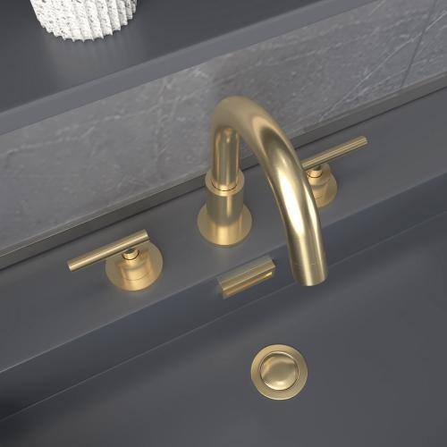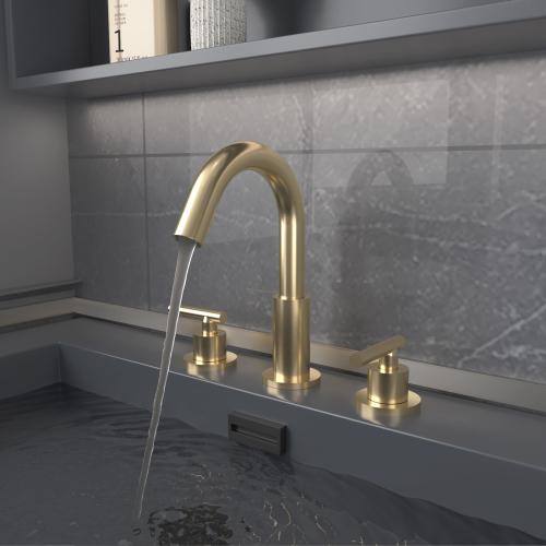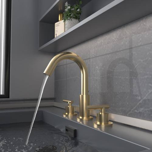 Upgrade your bathroom aesthetics with the Lukvuzo Double Handle Widespread Bathroom Faucet in Brushed Gold. This faucet features a high-arc swivel spout for ease of use and dual lever handles for precision control. Crafted from solid brass, it's designed for durability and a quick, hassle-free installation.
