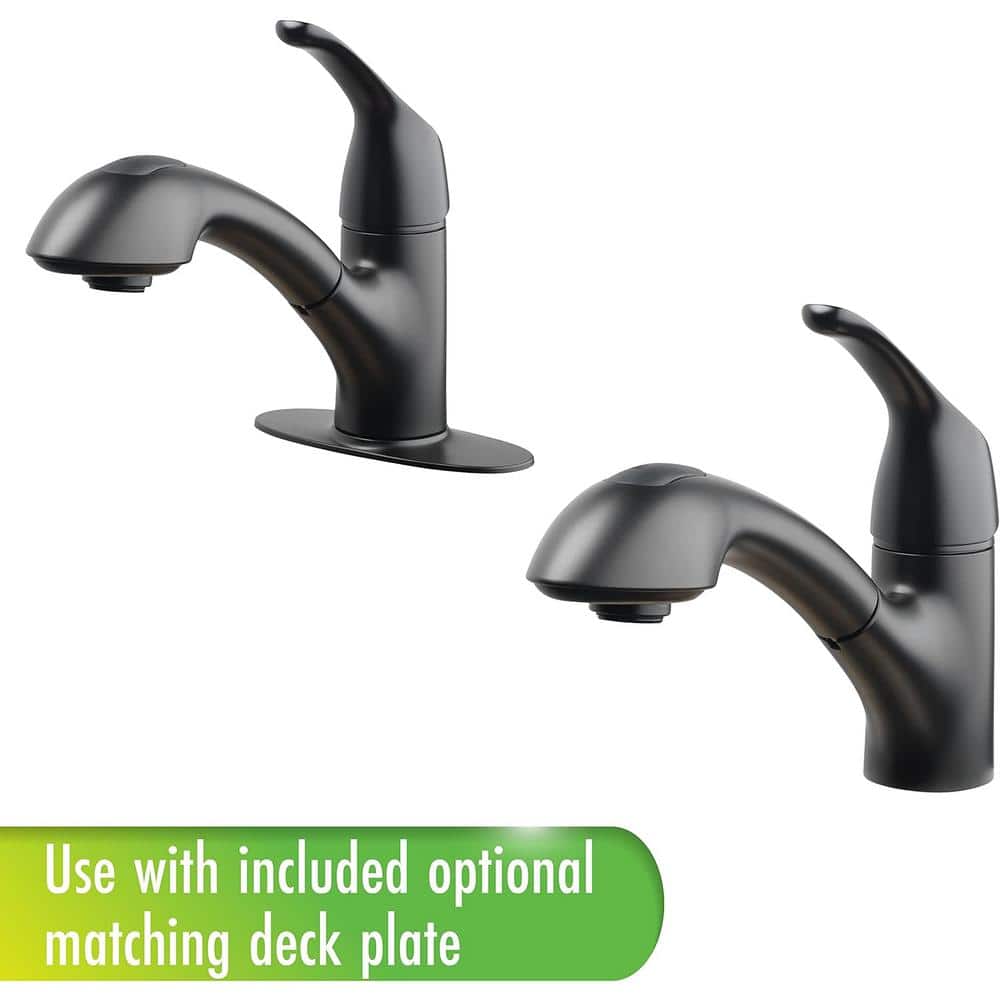 A: The Lukvuzo Pull-Out Utility Faucet includes a deck plate suitable for single or 3-hole sink installations, ensuring easy and flexible setup.