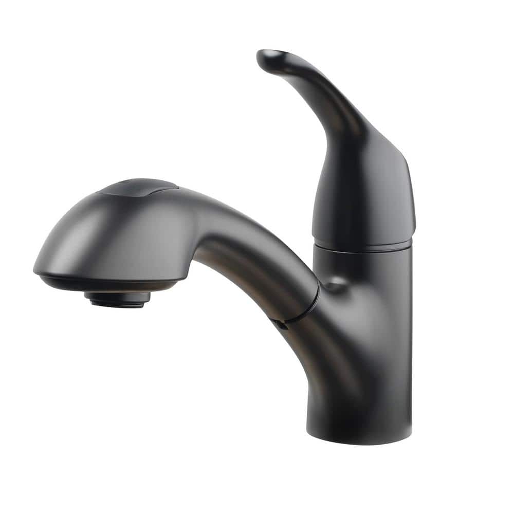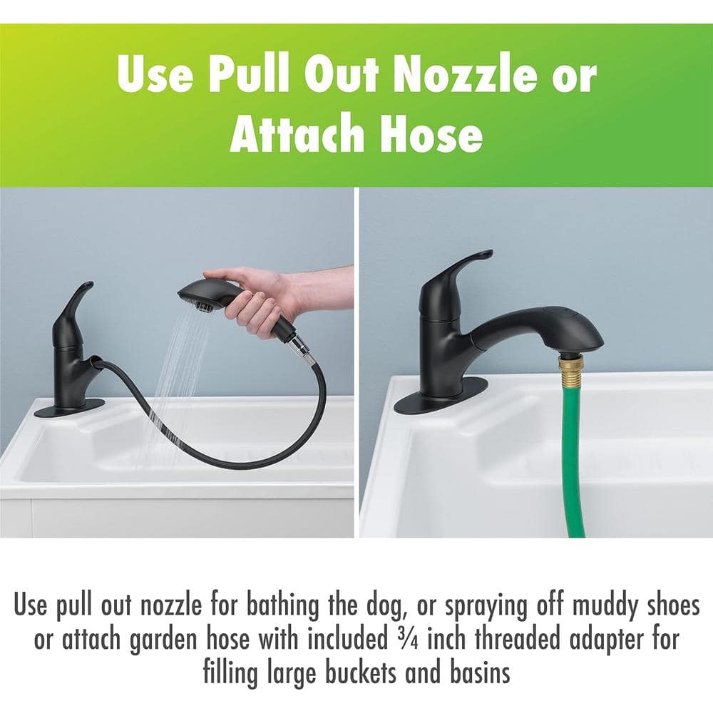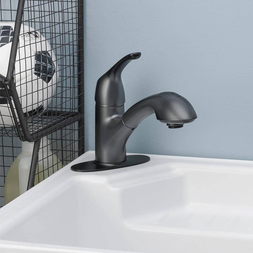 Upgrade your utility space with the Lukvuzo Single Handle Pull-Out Utility Faucet in a contemporary matte black finish. Its high flow rate and pull-out spray head make it versatile for tasks such as washing delicates or filling buckets, while the durable PVD coating ensures it remains rust-free and stylish over the years.