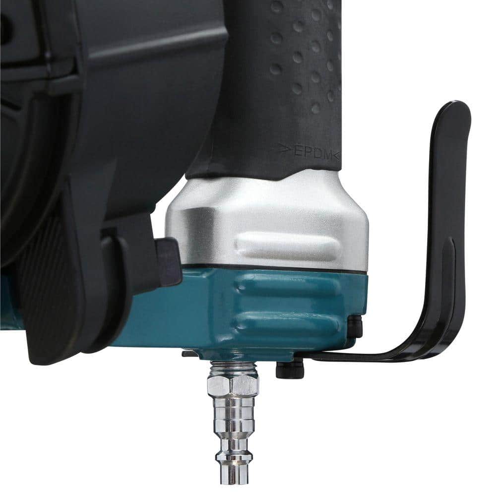 The Makita 1-3/4 in. Roofing Coil Nailer is a high-performance tool designed for professional contractors. Its durable aluminum construction ensures longevity while offering easier handling with less weight. The tool boasts a 120-nail capacity, adjustable canister, and "tool-less" depth adjustment for precision and efficiency on the job.