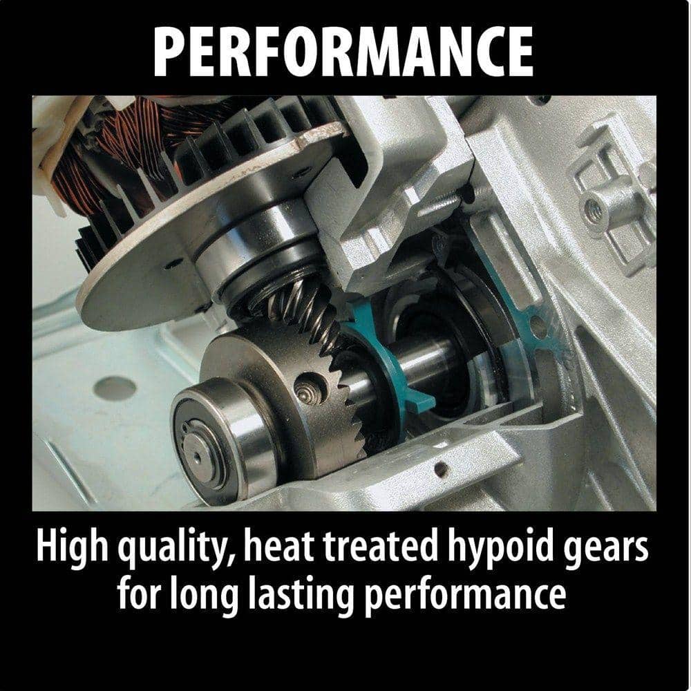A: The hypoid gear system allows for greater surface contact than conventional worm drive gears, resulting in increased power transfer efficiency, reduced noise, and enhanced tool longevity.