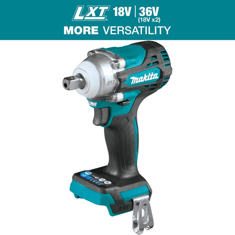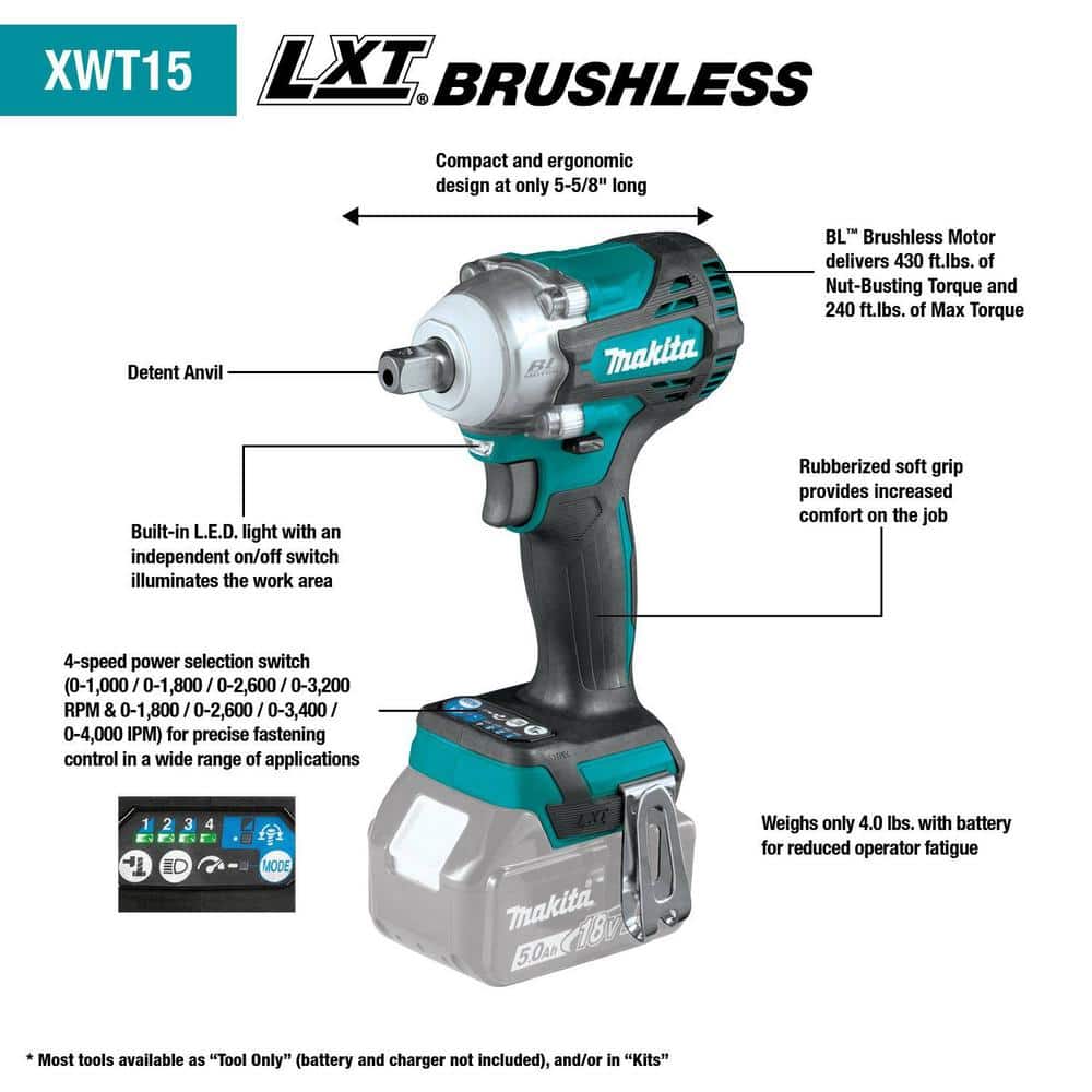 The Makita 18V LXT Lithium-Ion Brushless Cordless 4-Speed 1/2 in. Impact Wrench is engineered for high performance in the toughest fastening applications. Equipped with a robust brushless motor that delivers 430 ft. lbs. of nut-busting torque, it's ideal for automotive and fabrication professionals. Featuring Makita's Extreme Protection Technology (XPT), it withstands harsh jobsite conditions while its ergonomic design ensures comfort and control.