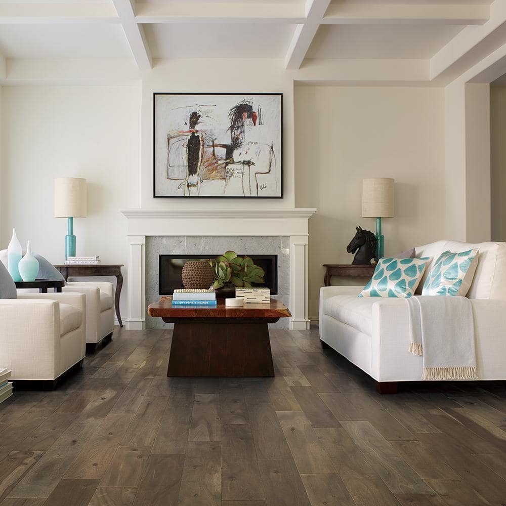 Walking on the Morro Bay Acacia flooring is akin to gracing a canvas of artistry and nature combined—a veritable masterpiece. The wirebrushed texture evokes the rustic yet refined charm of coastal living, where each plank tells a story of sun-bleached beaches. Imagine styling these floors with plush area rugs to highlight their luxurious depth, offering a timeless sophistication that's as inviting as it is stunning. Elevate your living space with a touch of the sublime—essential for any discerning abode.
