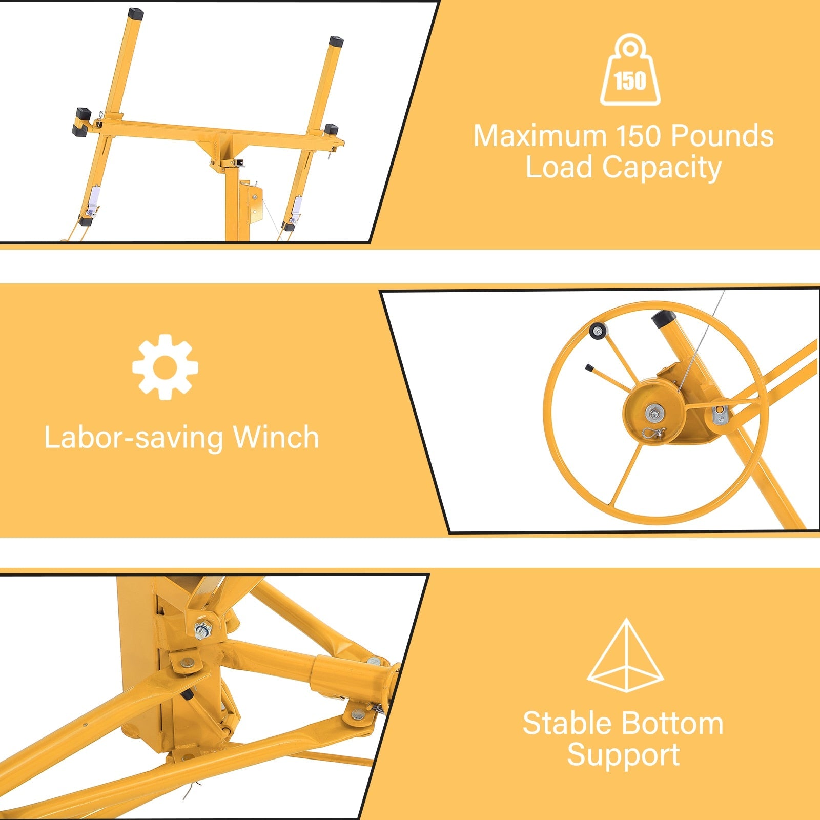 A: Yes, the lift can accommodate a variety of gypsum board sizes within its 150 lbs weight capacity, ensuring versatility across different projects.