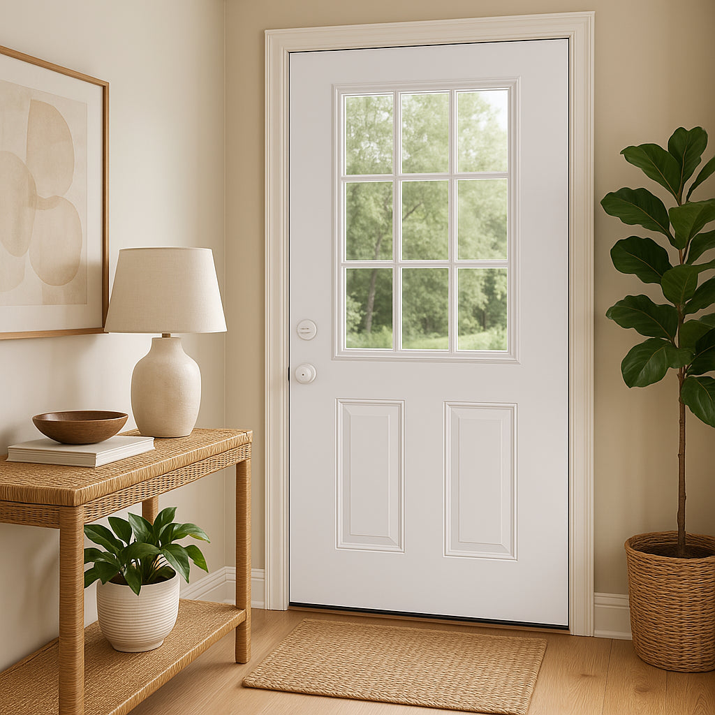 Channeling the enduring elegance of classic architecture, this Masonite 9 Lite Steel Door transforms any entryway into a welcoming focal point. The crisp, primed white finish and symmetrical glass lites invite natural light while maintaining privacy and security. I adore the interplay of the traditional paneling with the modern clarity of the glass—it's a harmonious blend that suits both contemporary and heritage homes. Style it with bold hardware and lush greenery to create an entrance that feels both grand and inviting, making this door an essential element of sophisticated, luxurious living.