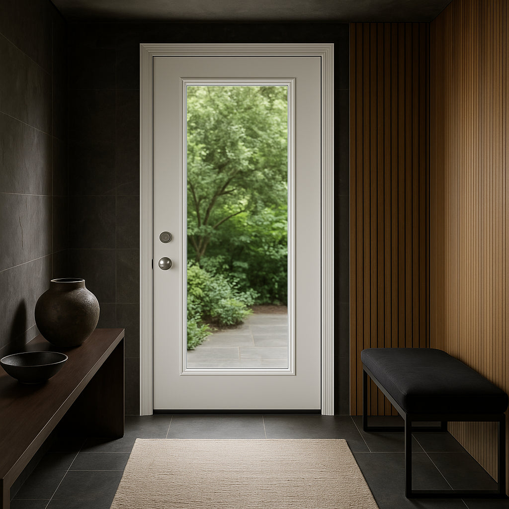 The Masonite Premium Full Lite Primed Steel Prehung Front Door with Brickmold combines the strength and security of steel with the elegance of a full glass panel. Its energy-saving core and triple-pane glass provide superior insulation, while the primed finish is ready for custom painting. This door is designed for lasting durability and a welcoming, modern entryway.