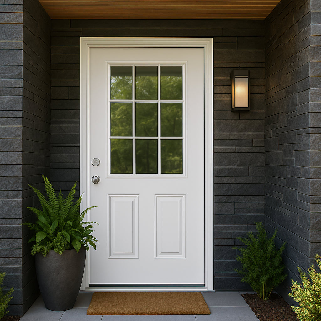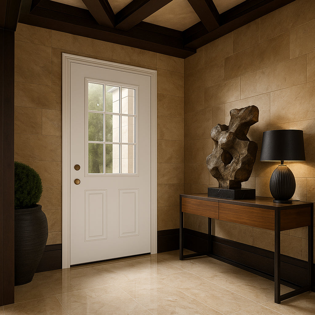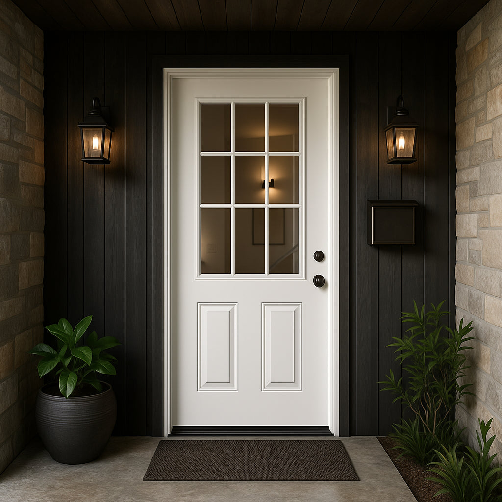 Channeling the refined elegance of classic architecture, this Masonite 9 Lite Fiberglass Door transforms any entryway into a welcoming focal point. The crisp, symmetrical grid of clear glass lites invites natural light while maintaining privacy, and the smooth, primed surface offers endless possibilities for custom color. I adore the authentic wood-look paneling paired with the durability of fiberglass—it's a harmonious blend of tradition and innovation. Style it with bold hardware and lush greenery to create an entrance that feels both inviting and distinctly luxurious, making every homecoming a moment of delight.