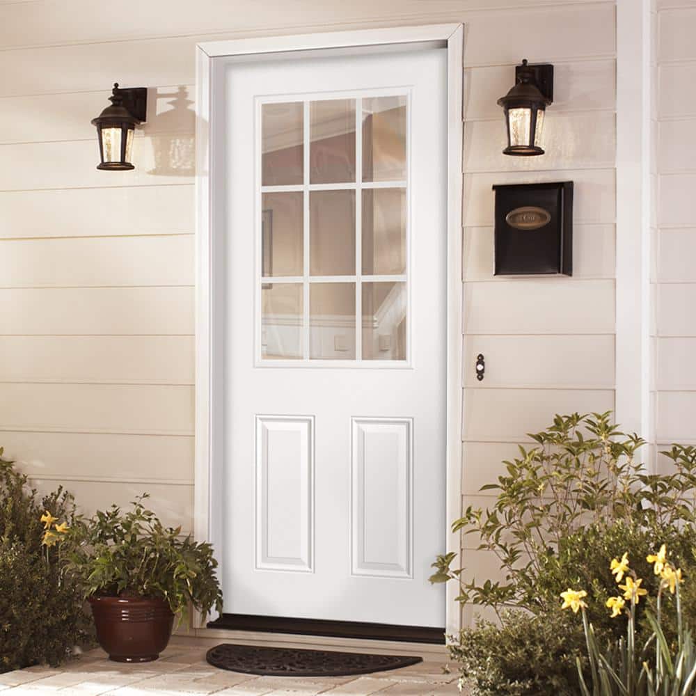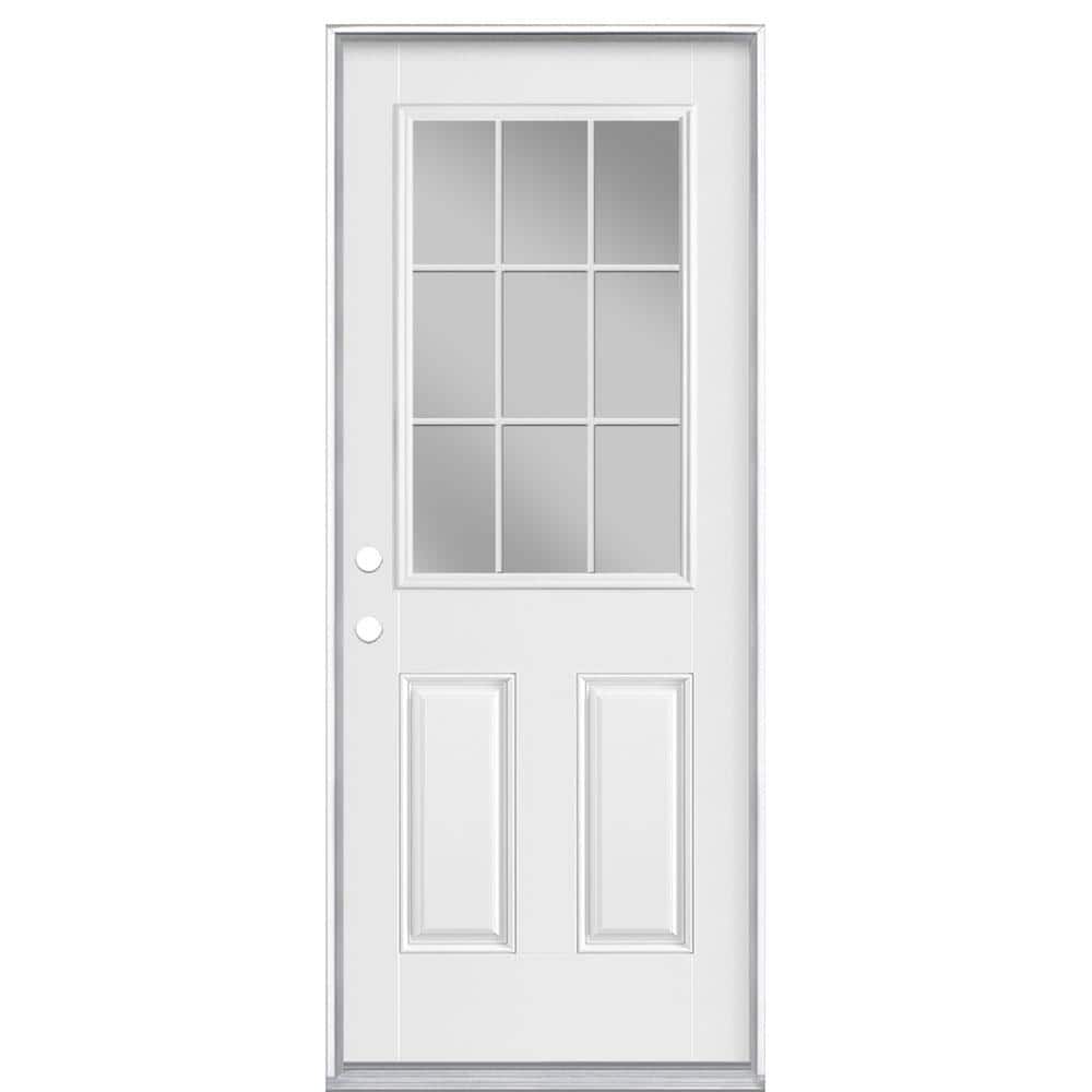 The Masonite 32 x 80 in. Right-Hand Inswing 9 Lite Primed Fiberglass Prehung Front Door combines the timeless look of wood with the durability and low maintenance of fiberglass. Featuring energy-efficient triple-pane glass and a reinforced lock block, this door is engineered for security, insulation, and long-lasting performance. Its smooth, primed surface is ready for painting, making it a versatile and stylish upgrade for any home entryway.