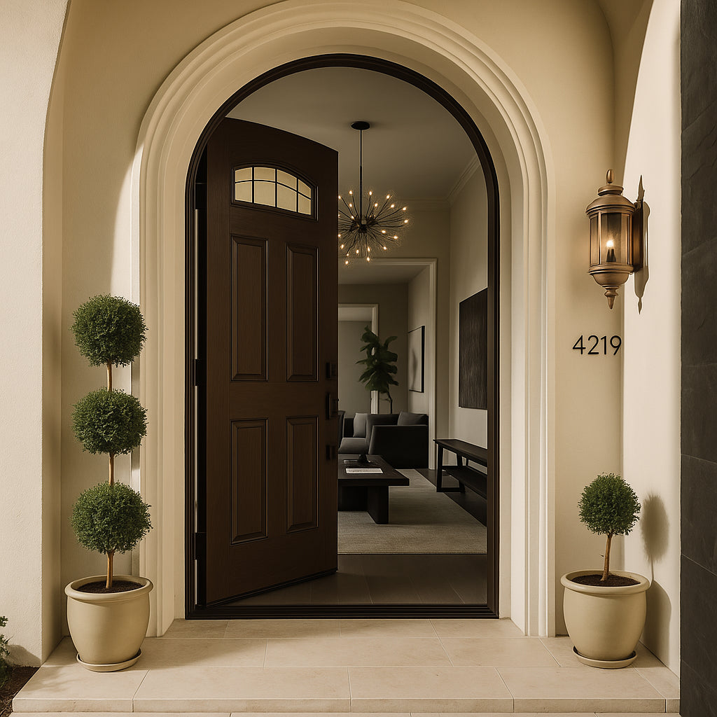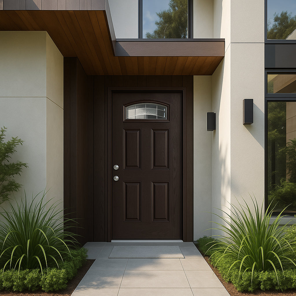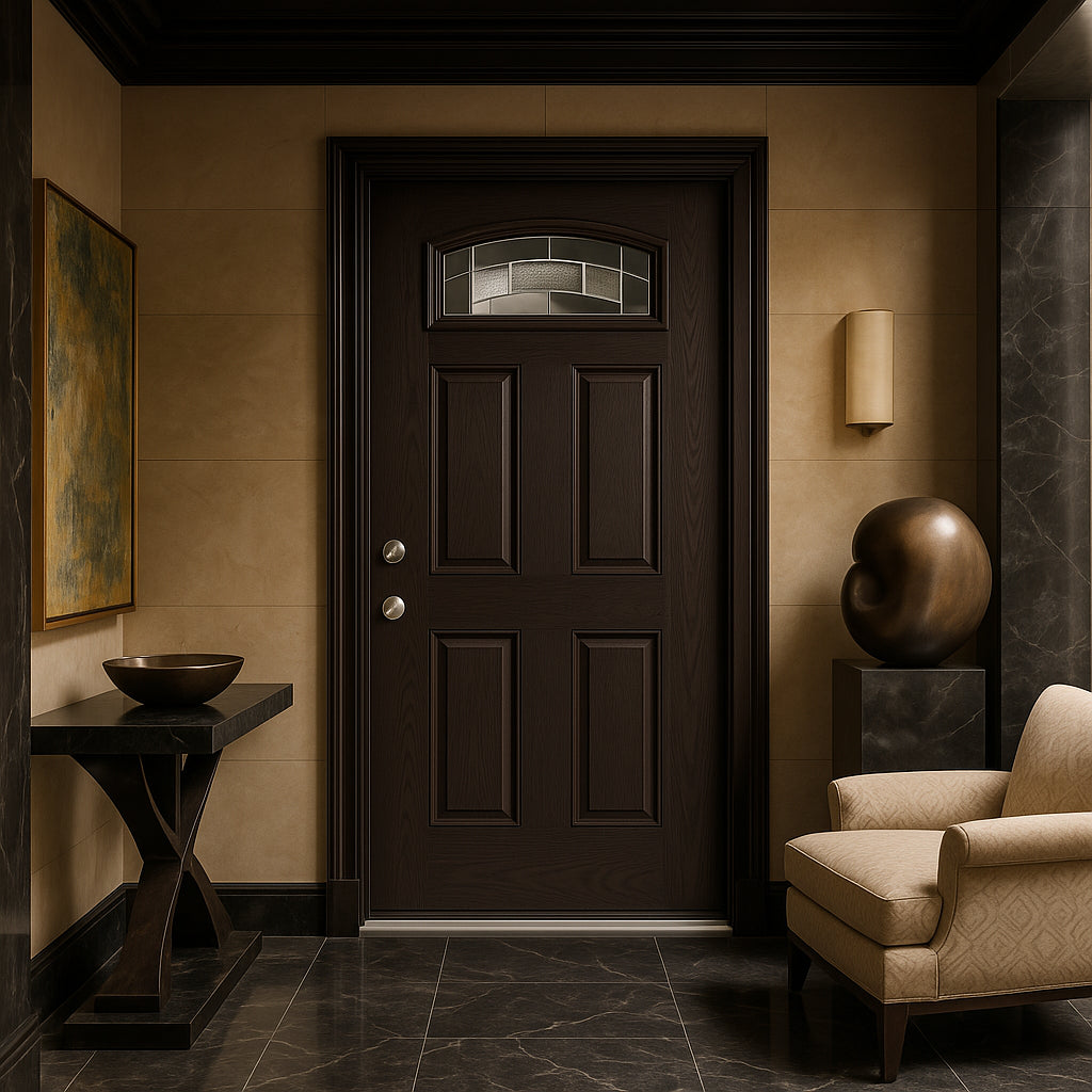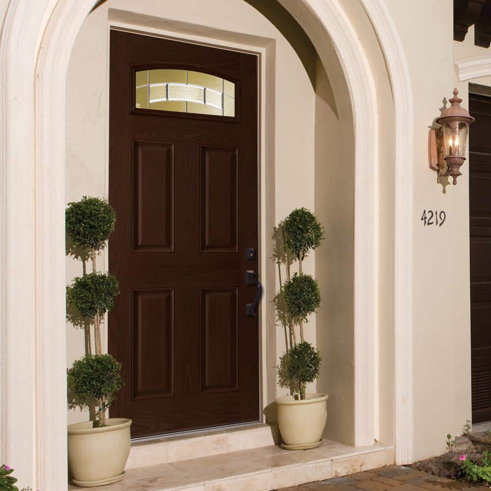Channeling the spirit of refined sophistication, the Masonite Croxley Camber Fan Lite Front Door transforms any entrance into a statement of luxury. The rich espresso oak grain finish and high-definition paneling evoke the warmth and authenticity of real wood, while the decorative camber fan lite glass adds a touch of artistry and light. Style this door with bold hardware and lush greenery to create a welcoming, dramatic threshold. This door is not just an entry—it's an invitation to experience everyday grandeur and enduring beauty.