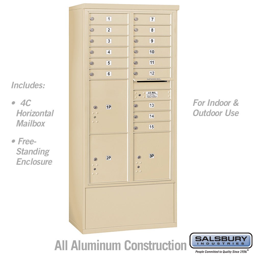 Maximum Height Free-Standing 4C Horizontal Mailbox with 15 Doors and 3 Parcel Lockers in Sandstone