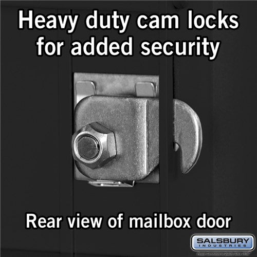 A: The mailbox features heavy-duty cam locks with dust/rain shields and 3 keys.