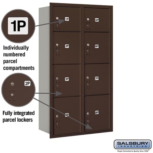 This recessed mounted parcel locker features 8 individually numbered compartments, a durable bronze powder-coated finish, and USPS-approved rear loading access. Ideal for residential or commercial use, it ensures secure package delivery with a 2-key security system.