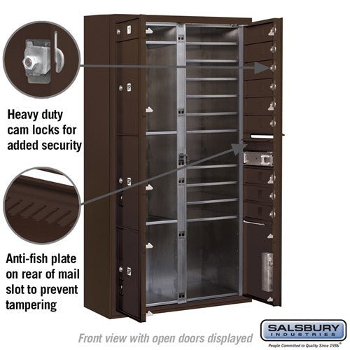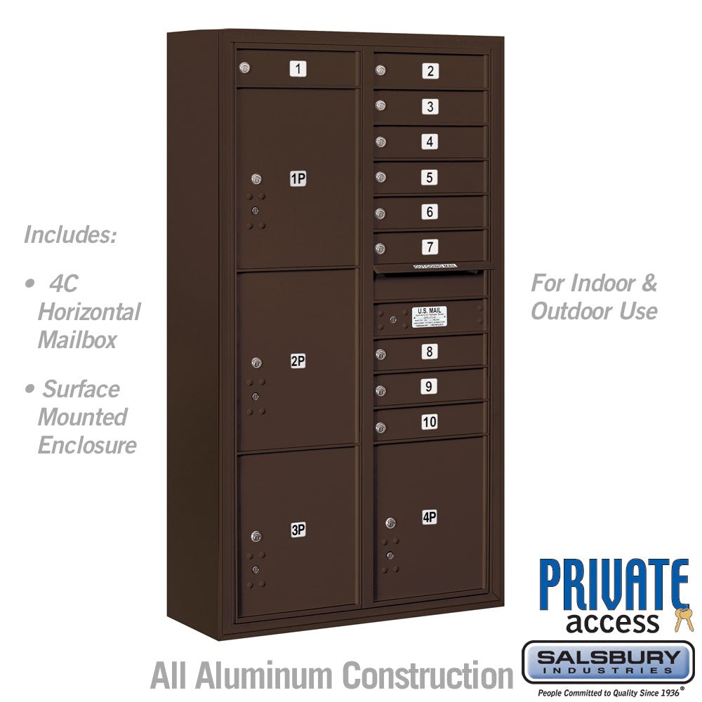 This surface-mounted 4C horizontal mailbox offers secure and organized mail and parcel storage with private access. Constructed from heavy-duty aluminum and stainless steel, it features a durable powder-coated bronze finish suitable for indoor and outdoor use.