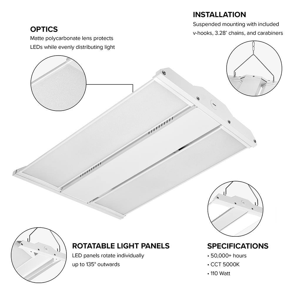 Brighten up expansive areas with the Maxxima LED Linear High Bay Shop Light, offering powerful illumination of 13,500 lumens with a cool 5000K daylight color. Designed for commercial settings, it features rotating adjustable light panels for ultimate flexibility and directionated lighting in demanding environments such as warehouses and workshops.