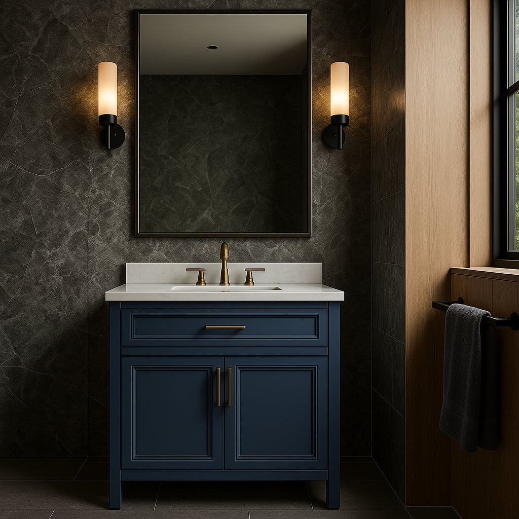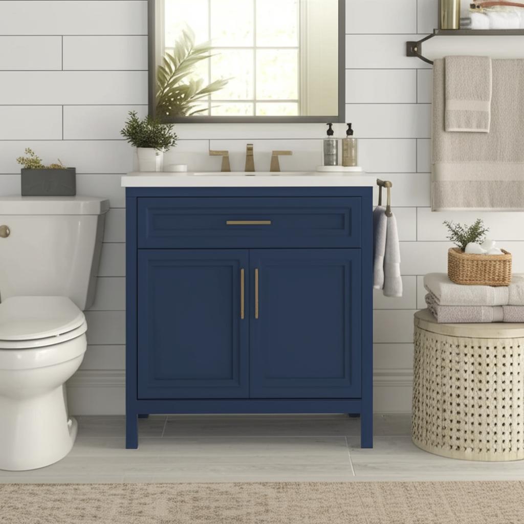 The Mayfield 36-inch vanity is a masterpiece of transitional design, blending modern sophistication with timeless charm. Its grayish blue finish and brass hardware create a striking visual impact, while the engineered stone top adds a touch of luxury. Style it with a pair of elegant sconces and a decorative mirror to complete the look. This vanity is not just a functional piece but a statement of refined taste, perfect for elevating any bathroom space.