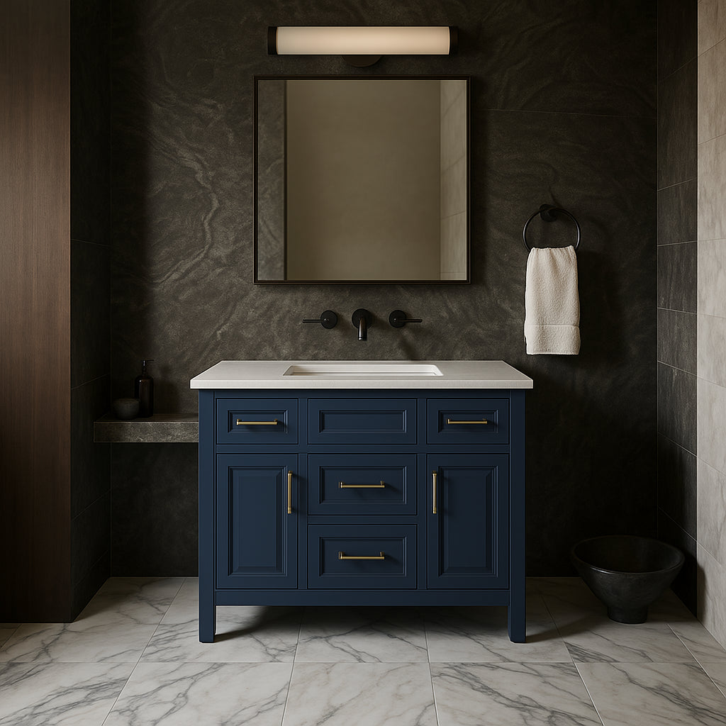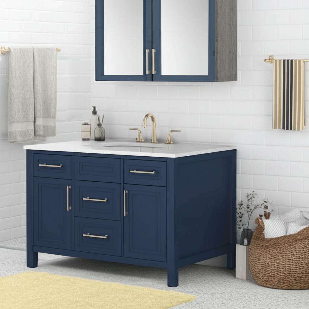 The Mayfield 42-inch vanity combines transitional design with practical functionality, featuring a grayish blue finish, brass hardware, and a durable engineered stone top. With ample storage and a ceramic undermount sink, it’s perfect for enhancing any bathroom.