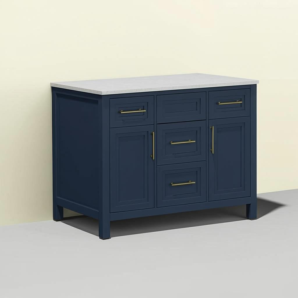 The Mayfield 42-inch vanity is a masterpiece of transitional design, blending a sophisticated grayish blue finish with the timeless appeal of brass hardware. Its engineered stone countertop and ceramic sink create a harmonious balance of durability and elegance. Style it with gold-accented fixtures and soft white towels to create a serene and luxurious bathroom retreat. This vanity is not just a functional piece but a statement of refined taste.