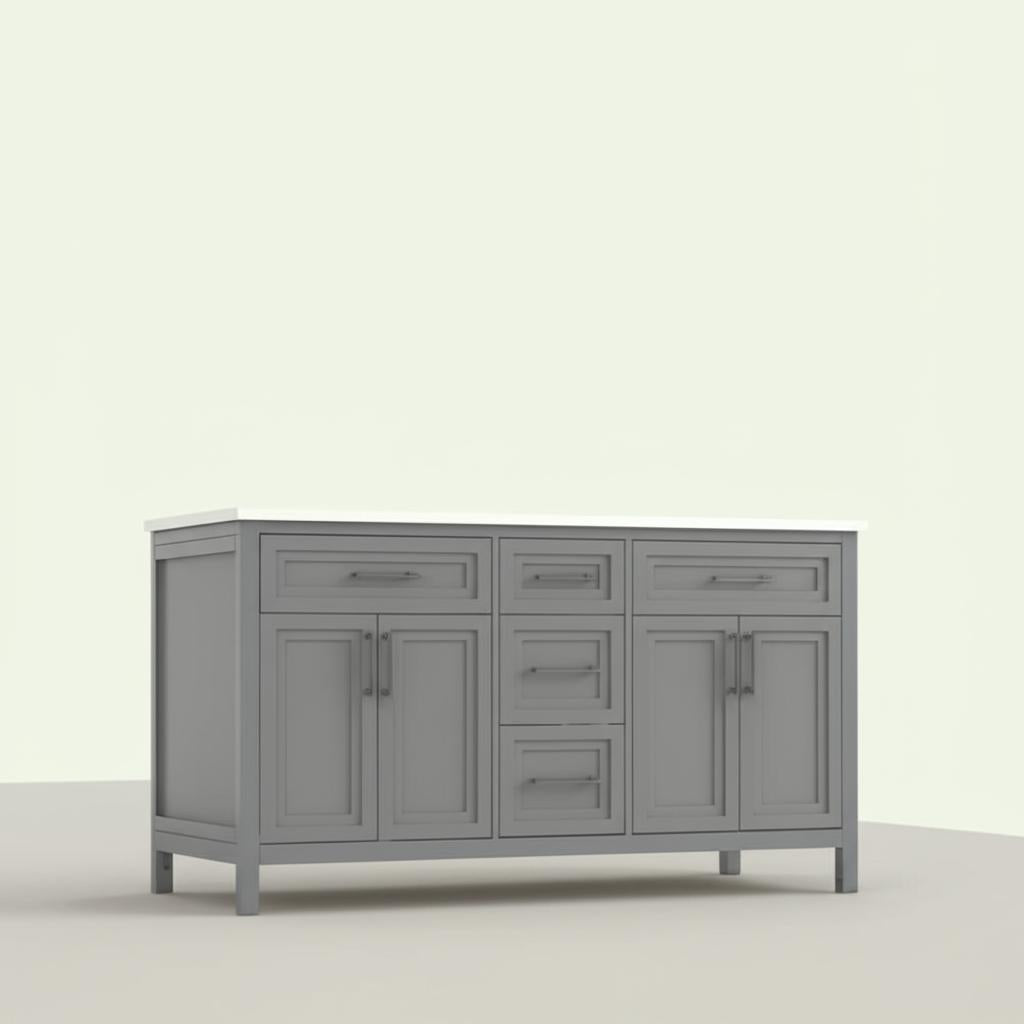 The Mayfield 60-inch double vanity combines transitional style with practical storage solutions. Featuring a durable engineered stone countertop, brushed nickel hardware, and a lacquered American Gray finish, this vanity is perfect for modern bathrooms.