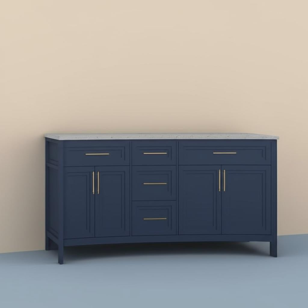 The Mayfield 60-inch double vanity is a masterpiece of transitional design, blending functionality with refined aesthetics. Its Grayish Blue lacquered base and brass hardware create a striking visual contrast, while the engineered stone countertop adds a touch of modern sophistication. Style it with gold-accented fixtures and plush towels to elevate your bathroom into a serene retreat. This vanity is not just a piece of furniture; it's a statement of luxurious living.