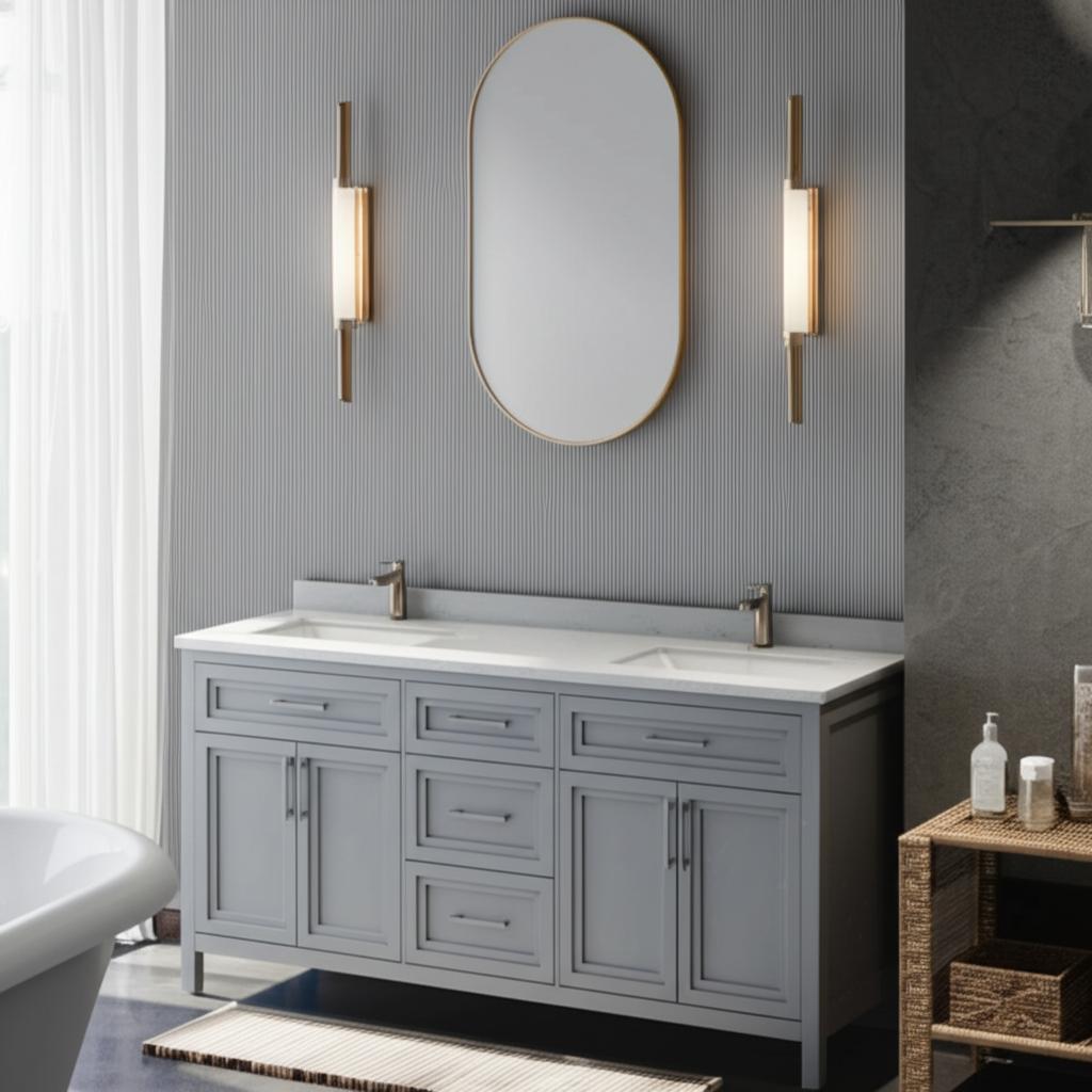 The Mayfield 72-inch double vanity transforms your bathroom into a sanctuary of sophistication. Its American Gray finish and brushed nickel hardware exude timeless elegance, while the engineered stone countertop adds a touch of modern luxury. Style it with soft, neutral tones and plush towels to create a serene spa-like atmosphere. This vanity is not just a piece of furniture; it's a statement of refined living.